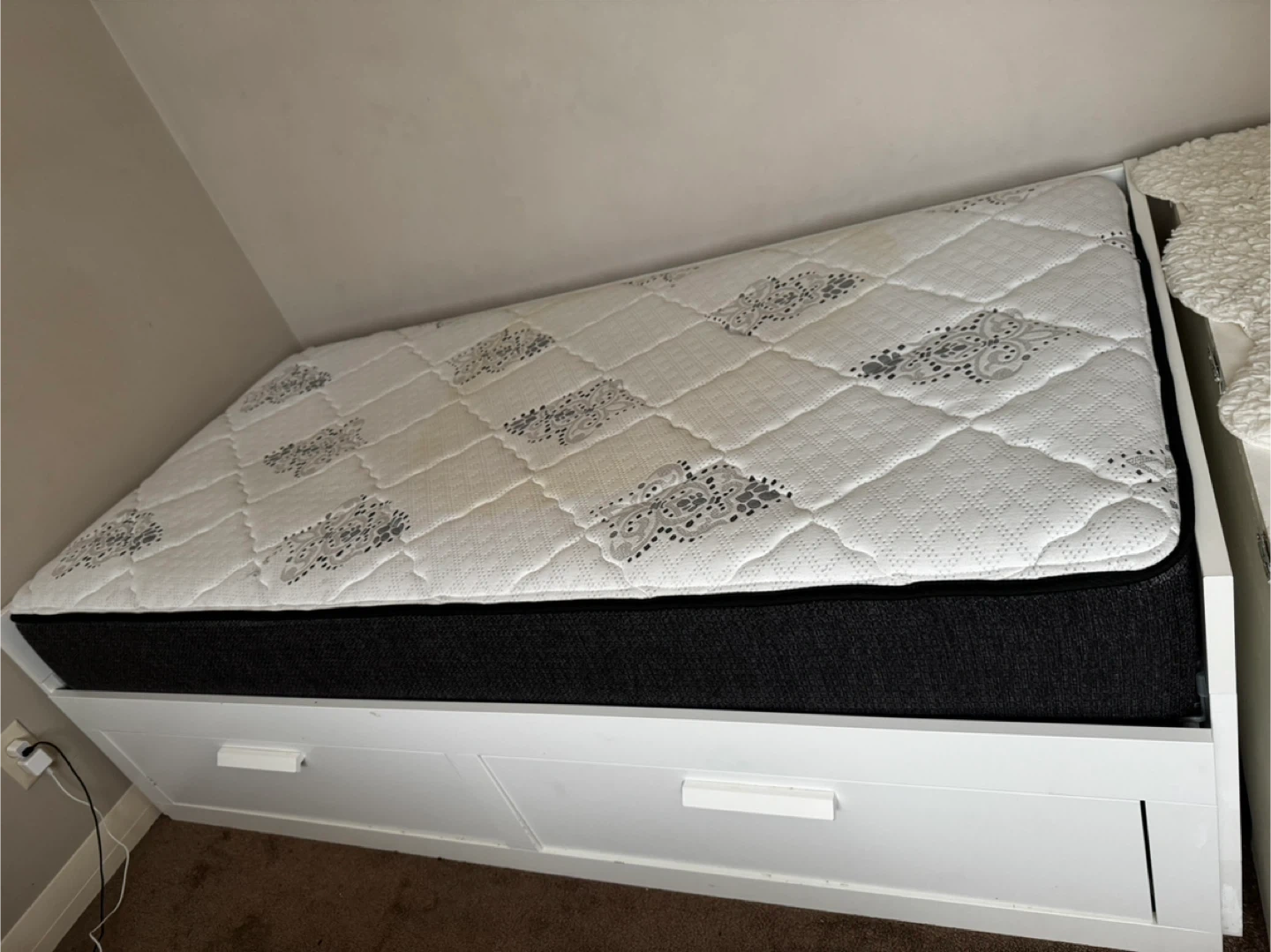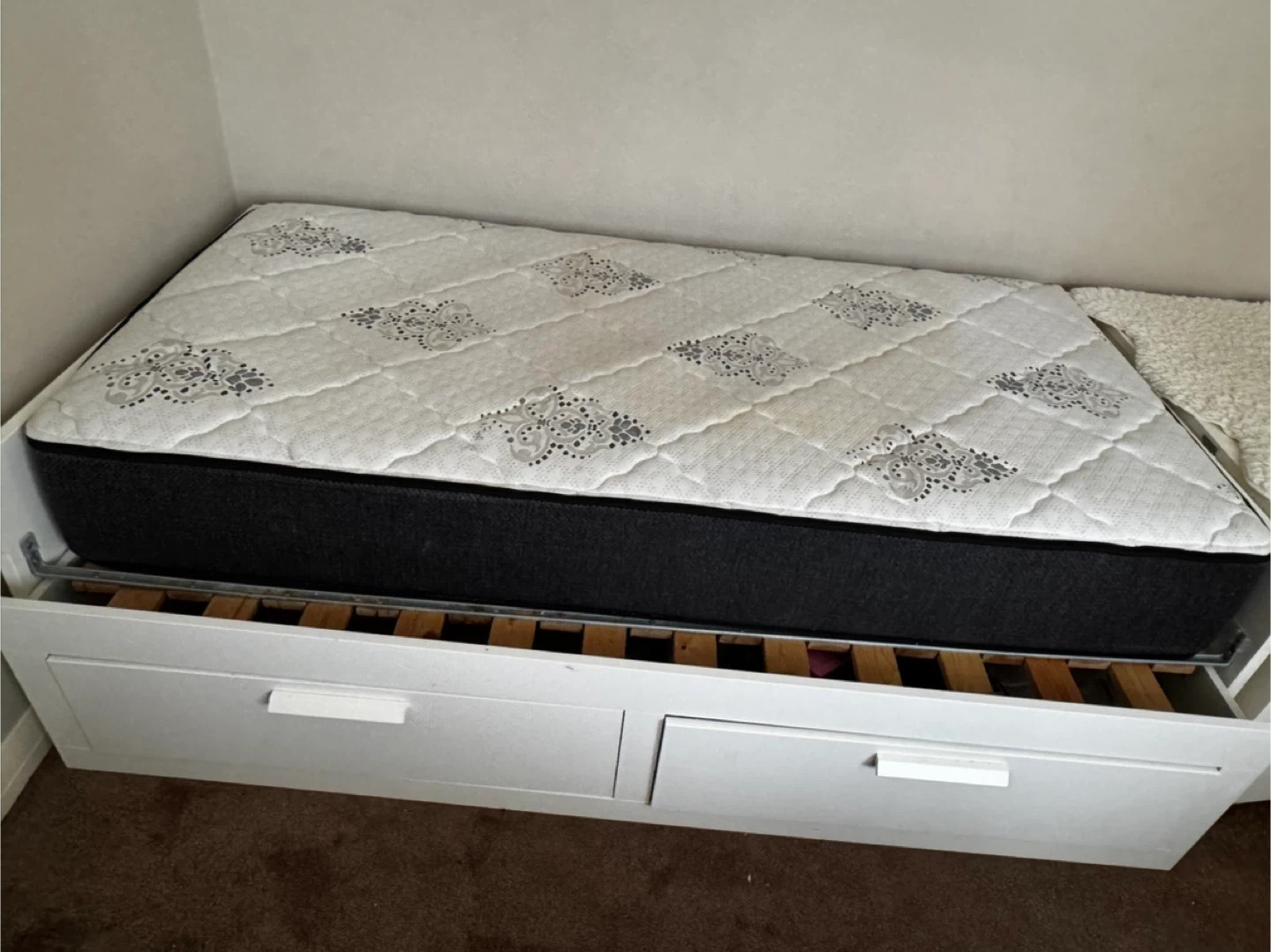 Selling an IKEA Hemnes daybed frame with three drawers! It's in good condition and perfect for a guest room or small space. The white finish is clean and modern, and the drawers offer great storage. Mattress included - home free pet and smoke