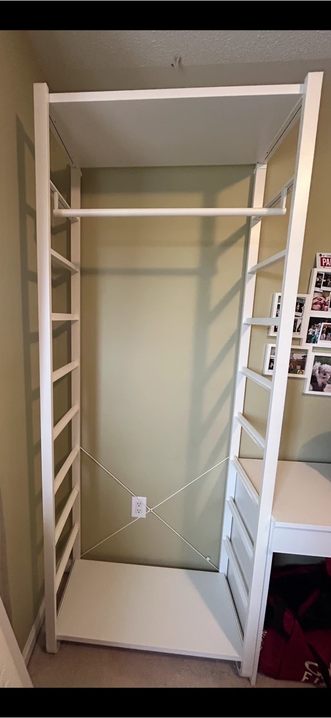 Selling a versatile IKEA ELVARLI open wardrobe system in white! It's great for organizing clothes and shoes. This system features shelves and a hanging rod, perfect for maximizing space. It's in good condition and ready to help you get organized