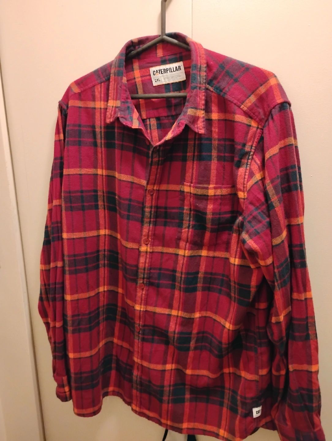 156Caterpillar Flannel shirt in size 2XL. The shirt features a classic plaid pattern in red, orange, and navy. Perfect for layering or wearing on its own!