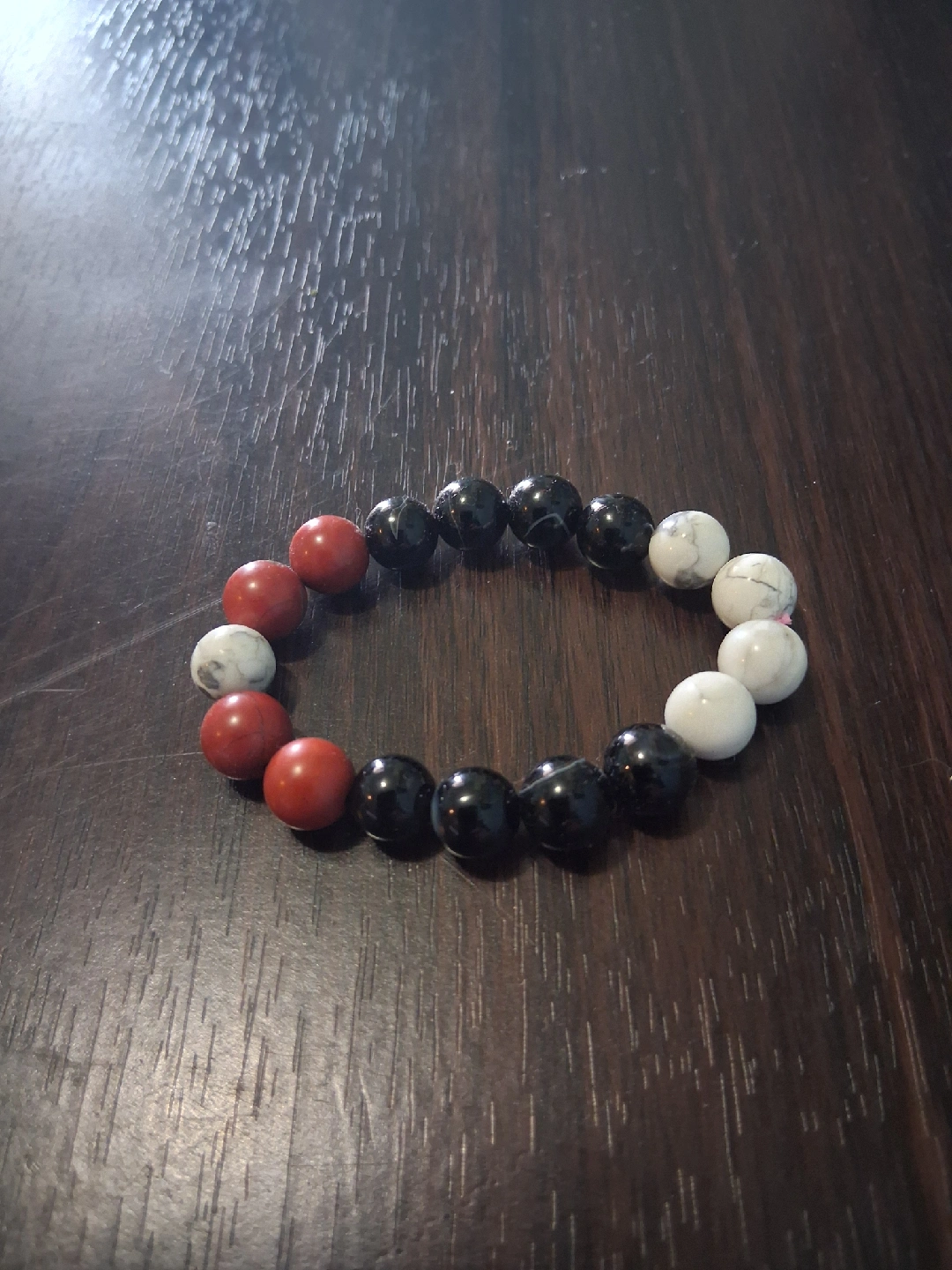 353Selling a beaded bracelet with a mix of Carnelian Agate , Howlite, and Black Agate beads. It's in great condition and would make a nice addition to your accessories!