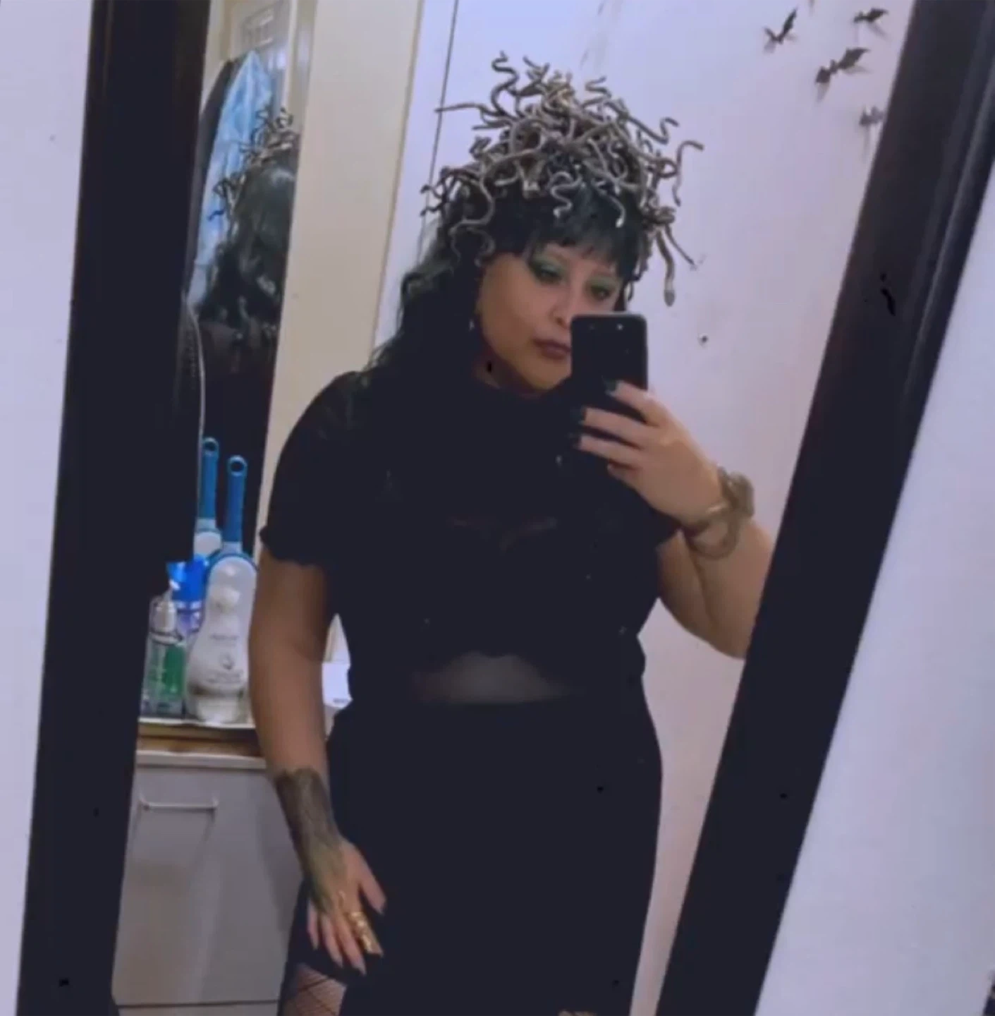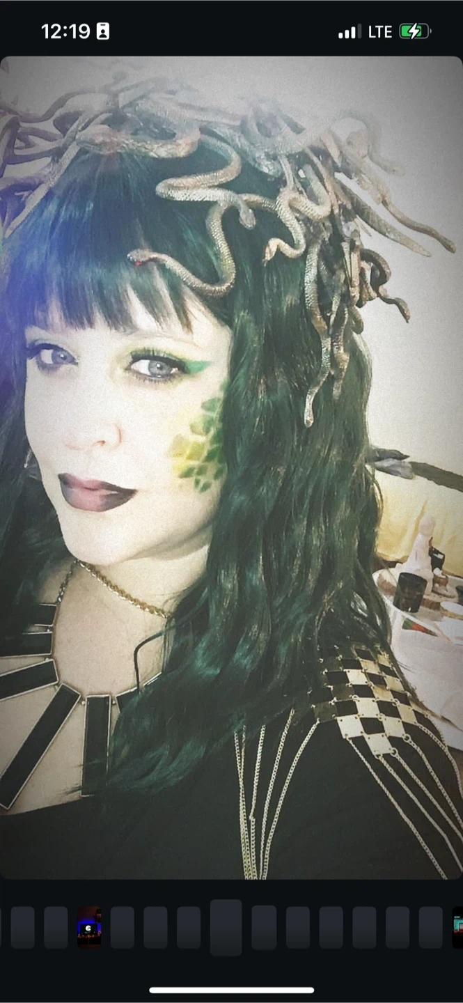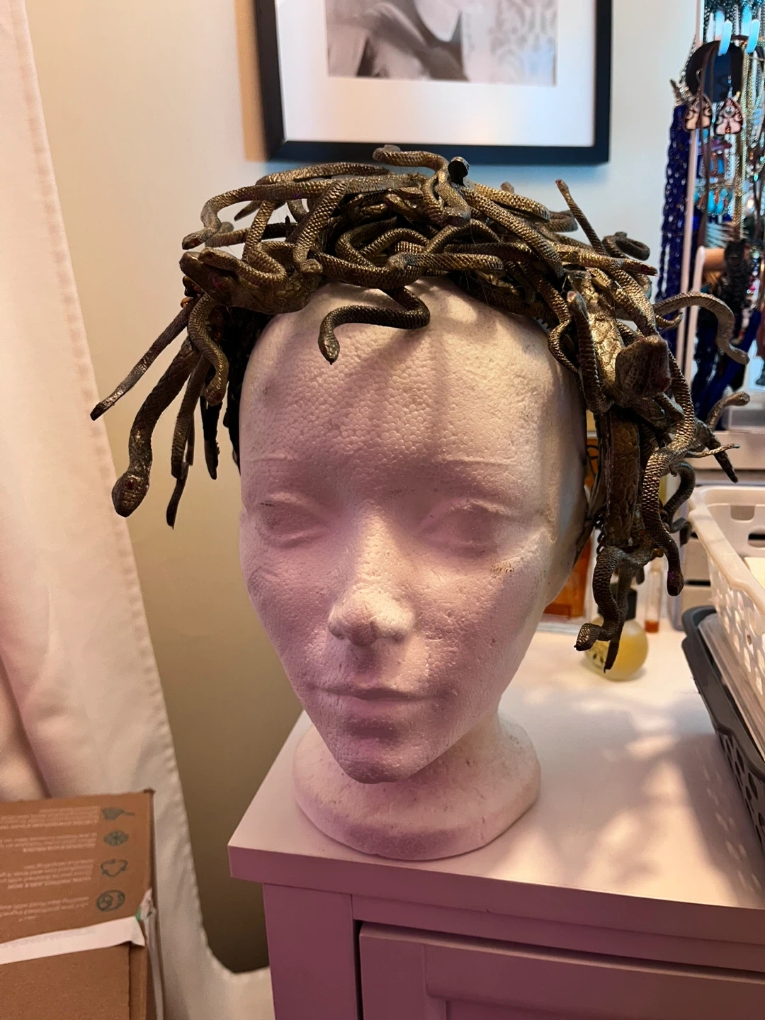 Get ready to transform into Medusa this Halloween with this costume set! The snake headpiece was handmade by me (it’s a headband). It includes a wavy green wig, curly gold arm band, snake bracelet, and a decorative gold body jewelry piece that you wear overtop your clothing so it drapes across your chest and shoulders. Perfect for Halloween or costume parties. Priced fairly as the headpiece was hand made and everything else was purchased individually for a higher price than what I’m asking.