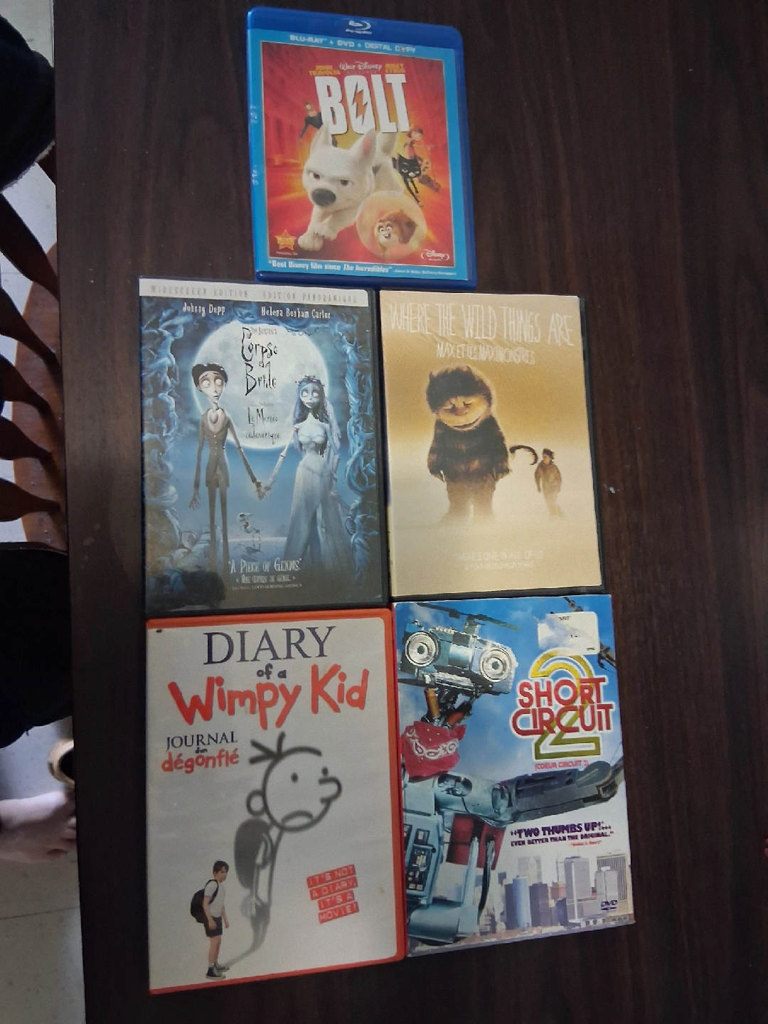 353Selling a collection of DVDs including: - Bolt (Blu-ray + DVD + Digital Copy) - Corpse Bride (Widescreen Edition) - Where the Wild Things Are - Diary of a Wimpy Kid (Journal dégonflé) - Short Circuit 2