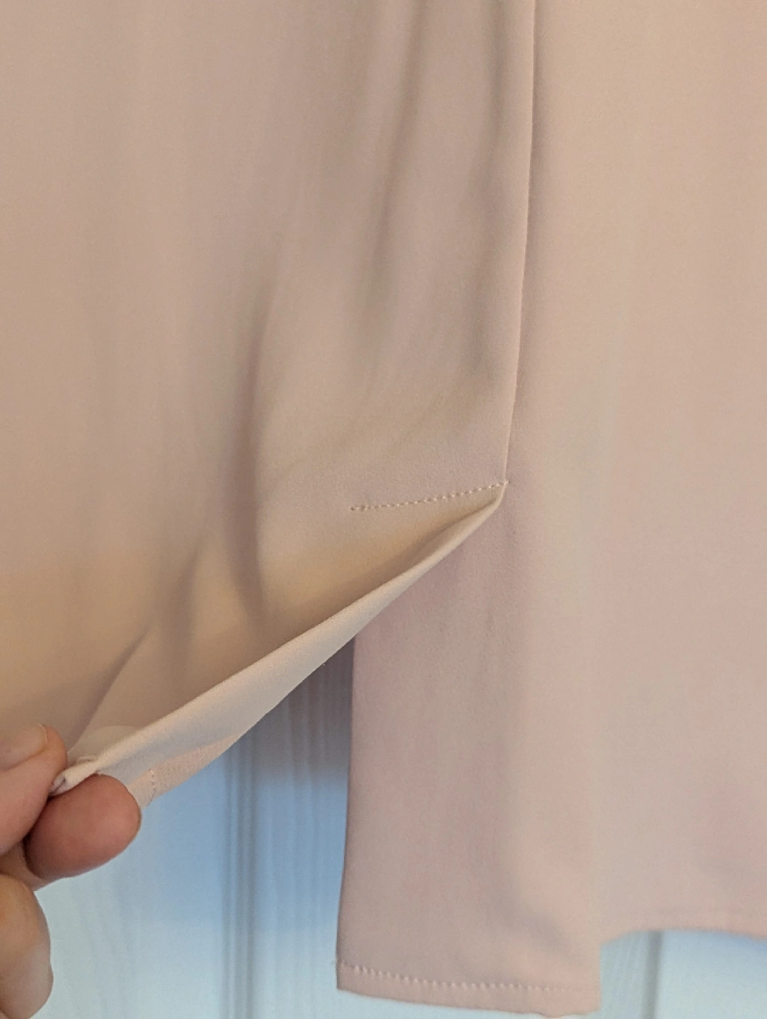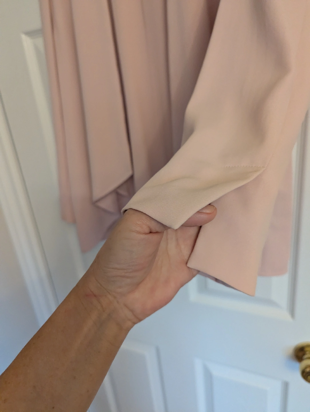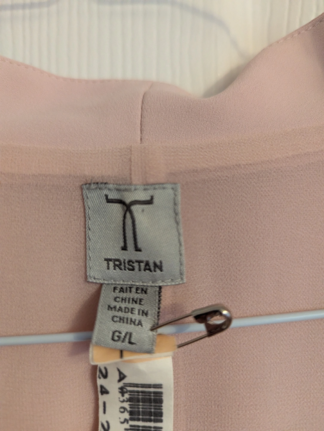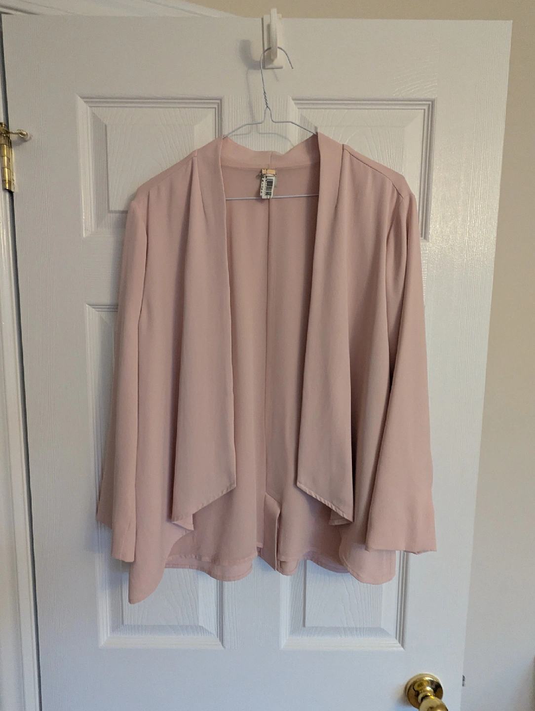 Here's a Tristan open front blazer in a lovely pink shade! It's a size G/L (G stands for Grand/Large). The material is 100% polyester, making it lightweight and easy to care for