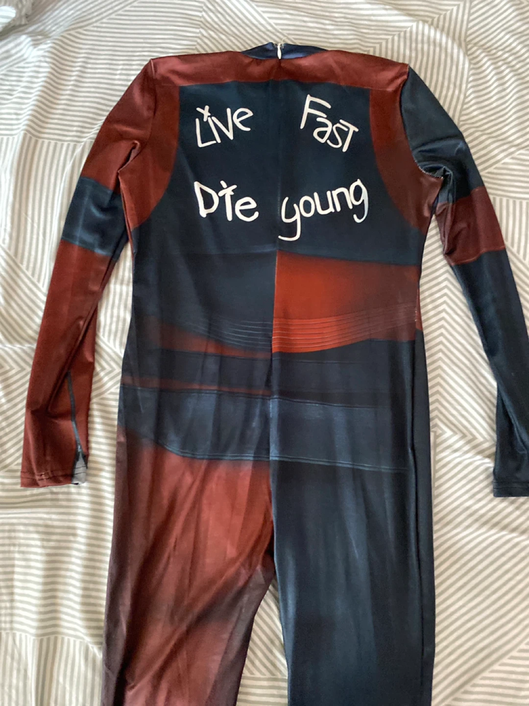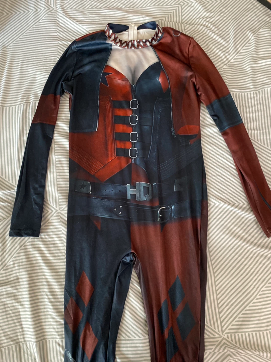 Harley Quinn costume onesie with a print design. Features the iconic Harley Quinn colours and details. The back has the words 'Live Fast Die Young' printed on it. Perfect for Halloween or cosplay