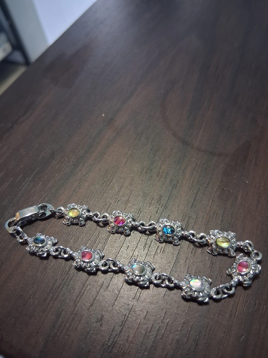 353A lovely silver-tone bracelet featuring colourful stones. It's in great condition and would make a beautiful addition to any jewelry collection! The bracelet has a secure clasp.