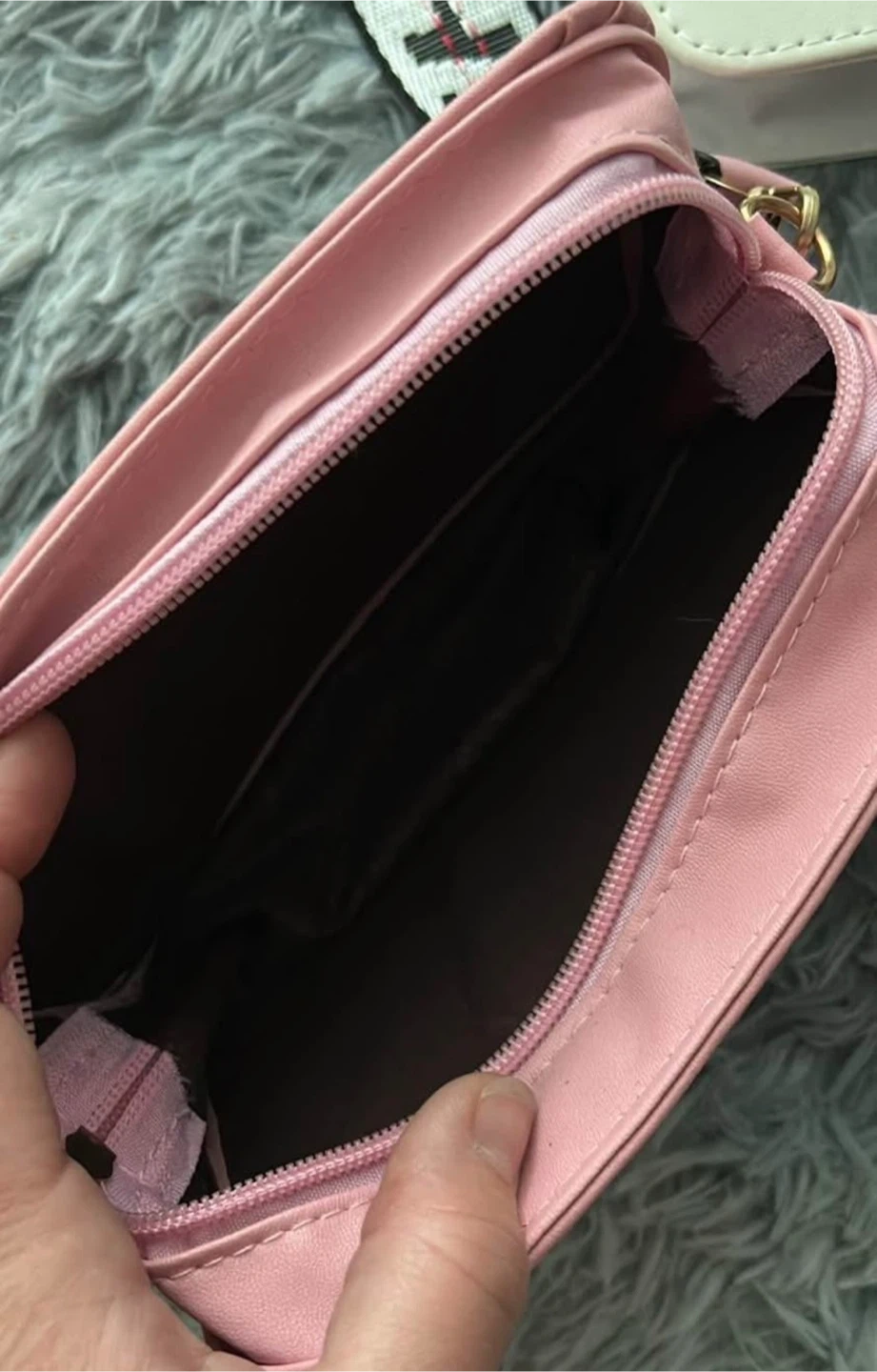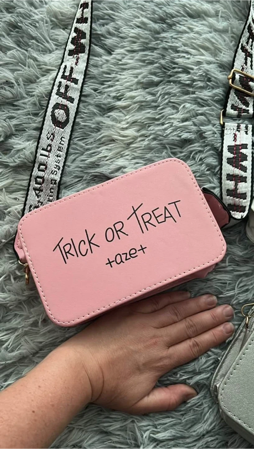 89Cute pink crossbody bag with 'Trick or Treat +aze+' design! Perfect for adding a fun touch to your outfit