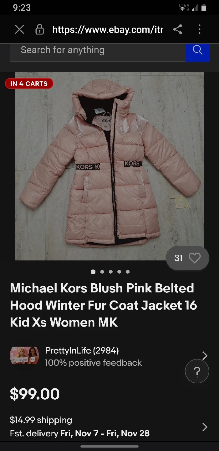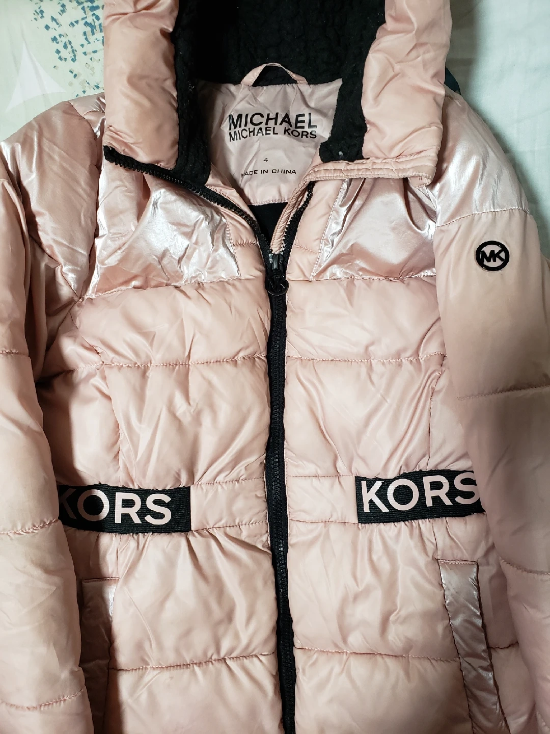 I'm selling a Michael Kors winter jacket in a lovely blush pink colour. It features a belted waist with the brand name on it and a hood for extra warmth! It's a size 4 and would be perfect for keeping cozy this winter