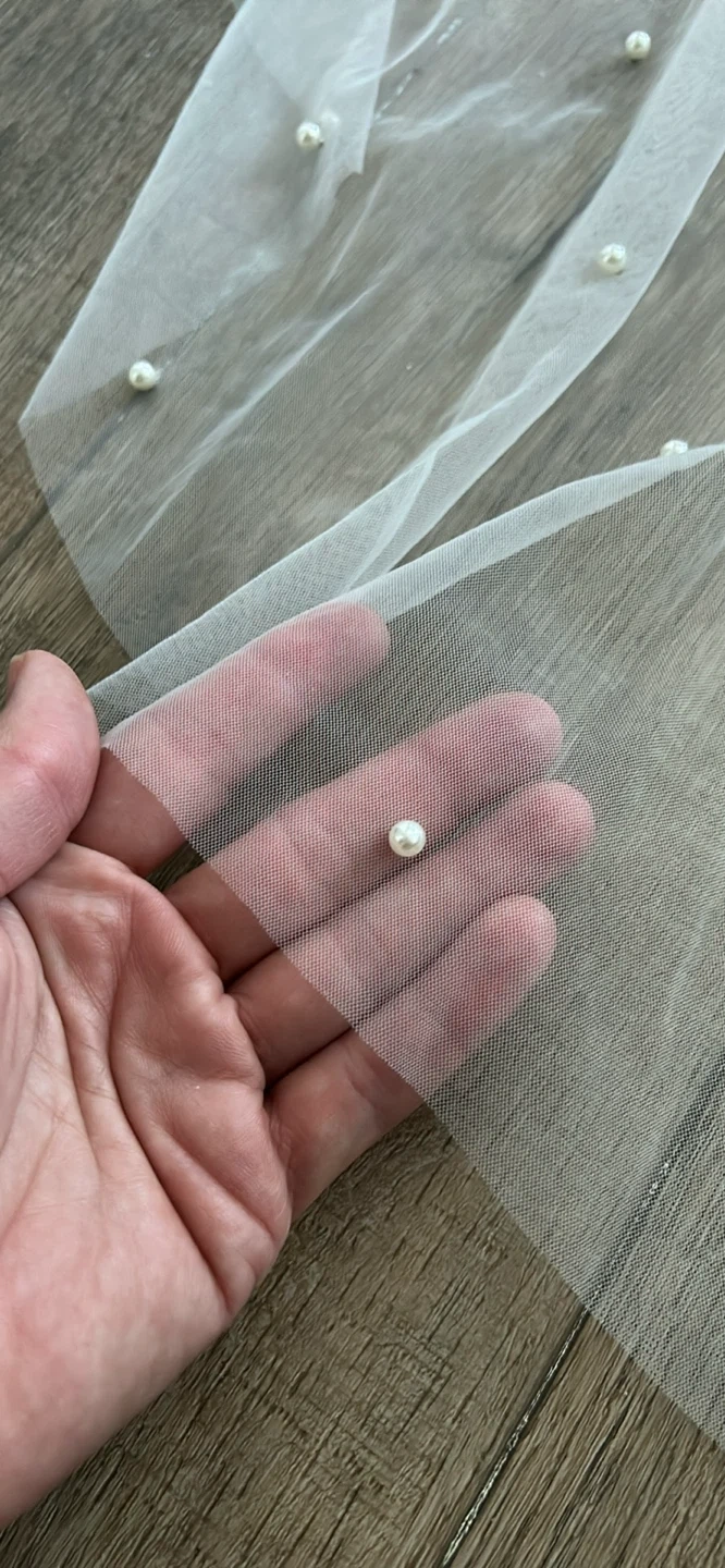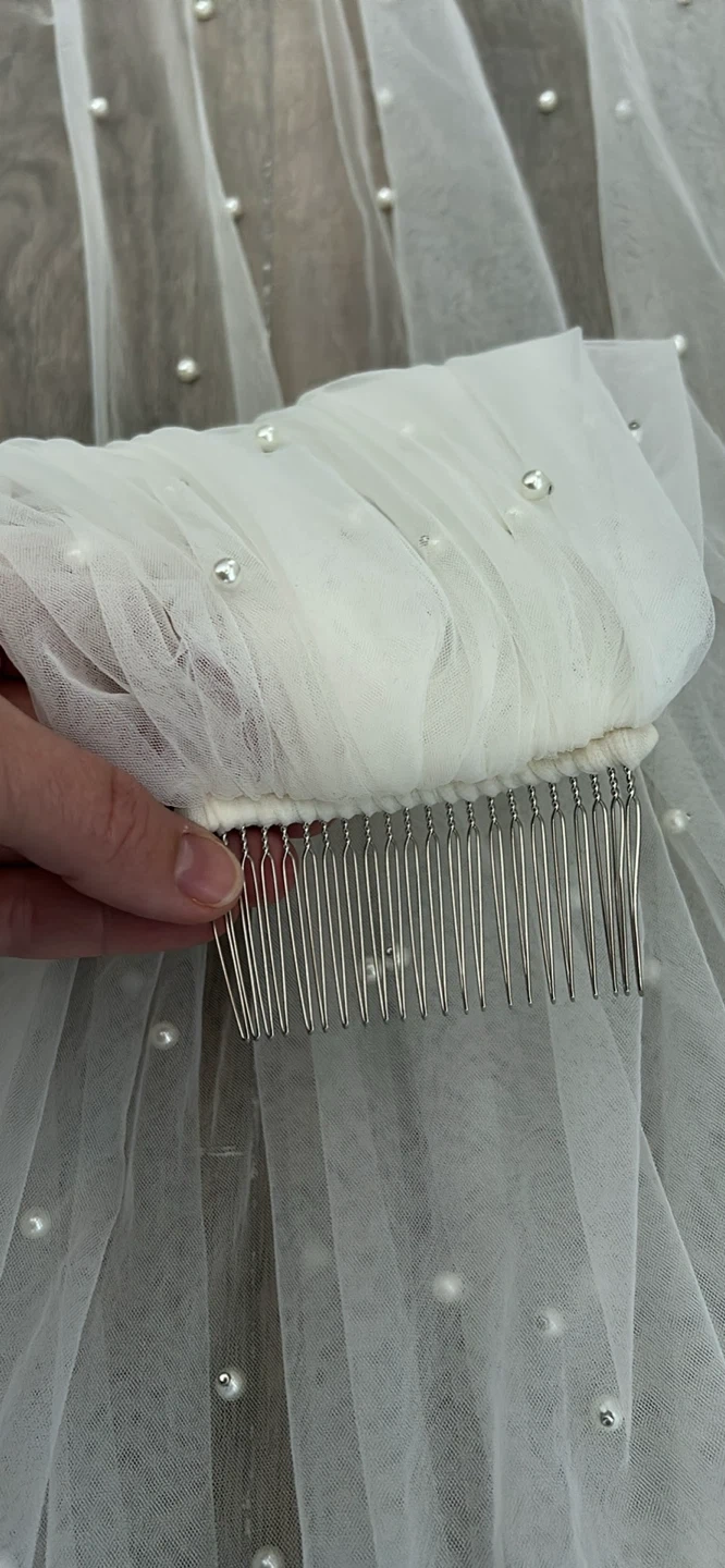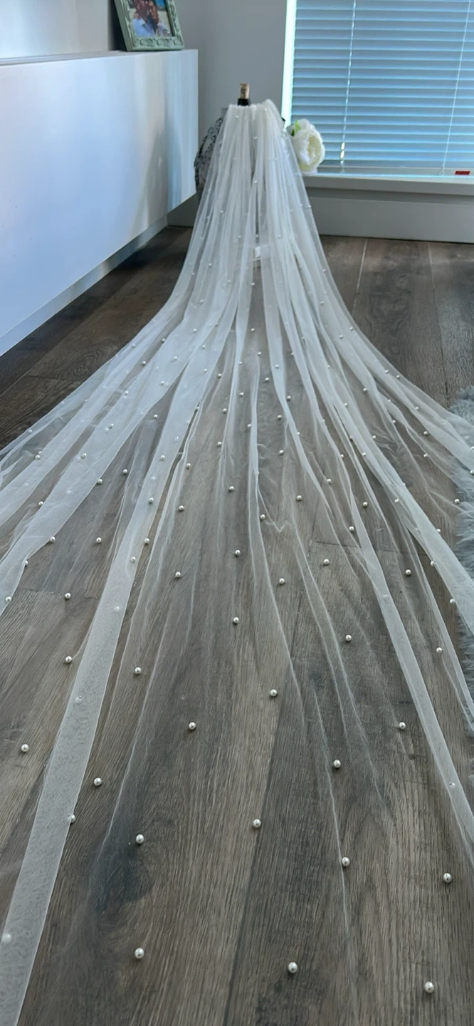89Selling a beautiful wedding veil adorned with delicate pearls. It's in great condition and will add a touch of elegance to your special day. The veil is lightweight and easy to wear, making it a comfortable choice for any bride. It has a comb attached for easy placement in your hair. New retail $749 Lisa’s bridal 250 cm Soft white and ivory avail