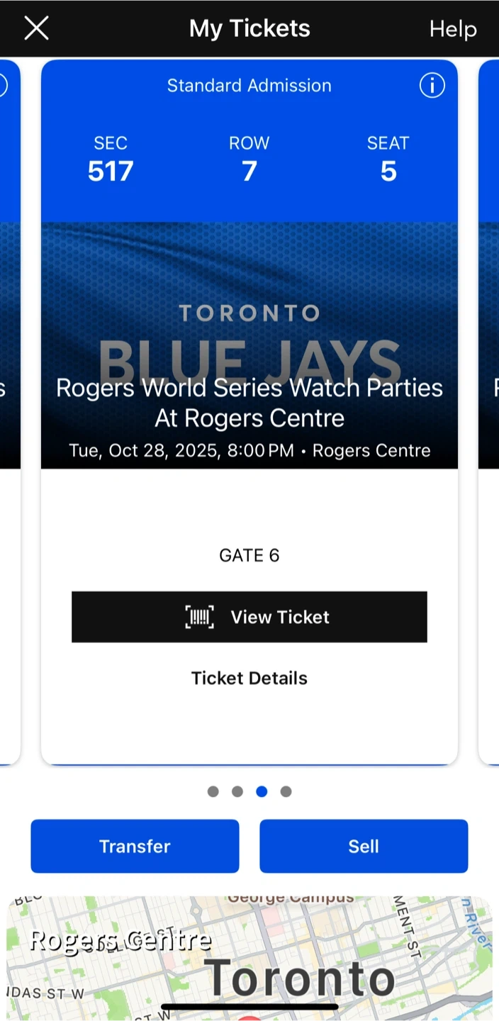 Selling 2 tickets for the Toronto Blue Jays World Series Watch Party at Rogers Centre on Tue, Oct 28, 2025, 8:00 PM! Standard Admission, Gate 6, SEC 517, ROW 7, SEAT 5 and 6.