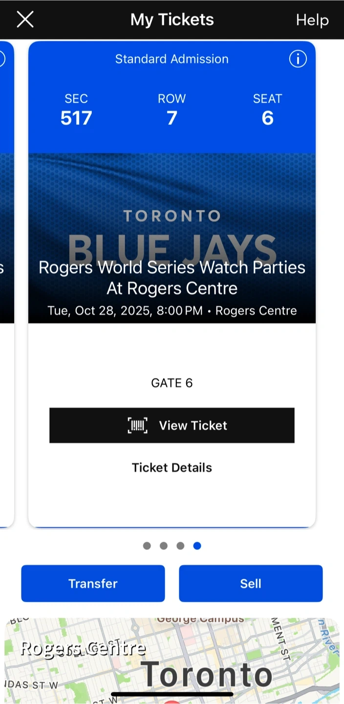 Selling 2 tickets for the Toronto Blue Jays World Series Watch Party at Rogers Centre on Tue, Oct 28, 2025, 8:00 PM! Standard Admission, Gate 6, SEC 517, ROW 7, SEAT 5 and 6.