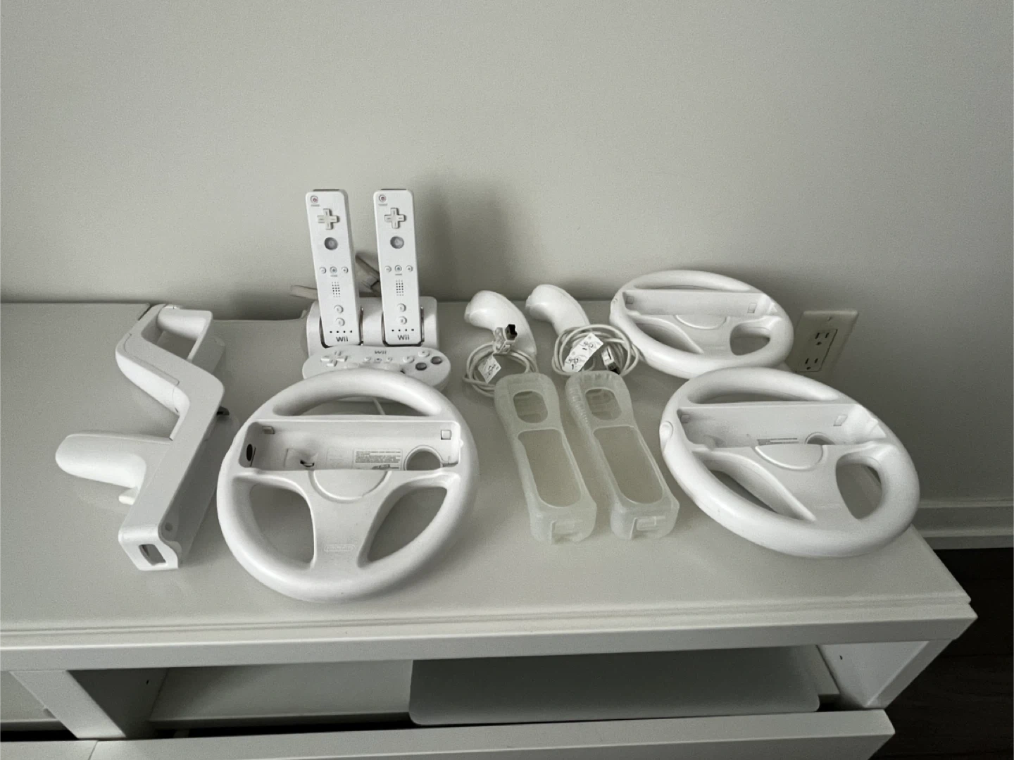 Includes the console, 2 Wii remotes with original case, 4 whells for Mario kart, classic controller, 2 nunchucks, gun for shot game included (ghost squad), sensor bar, power adapter, AV cables, and 6 games