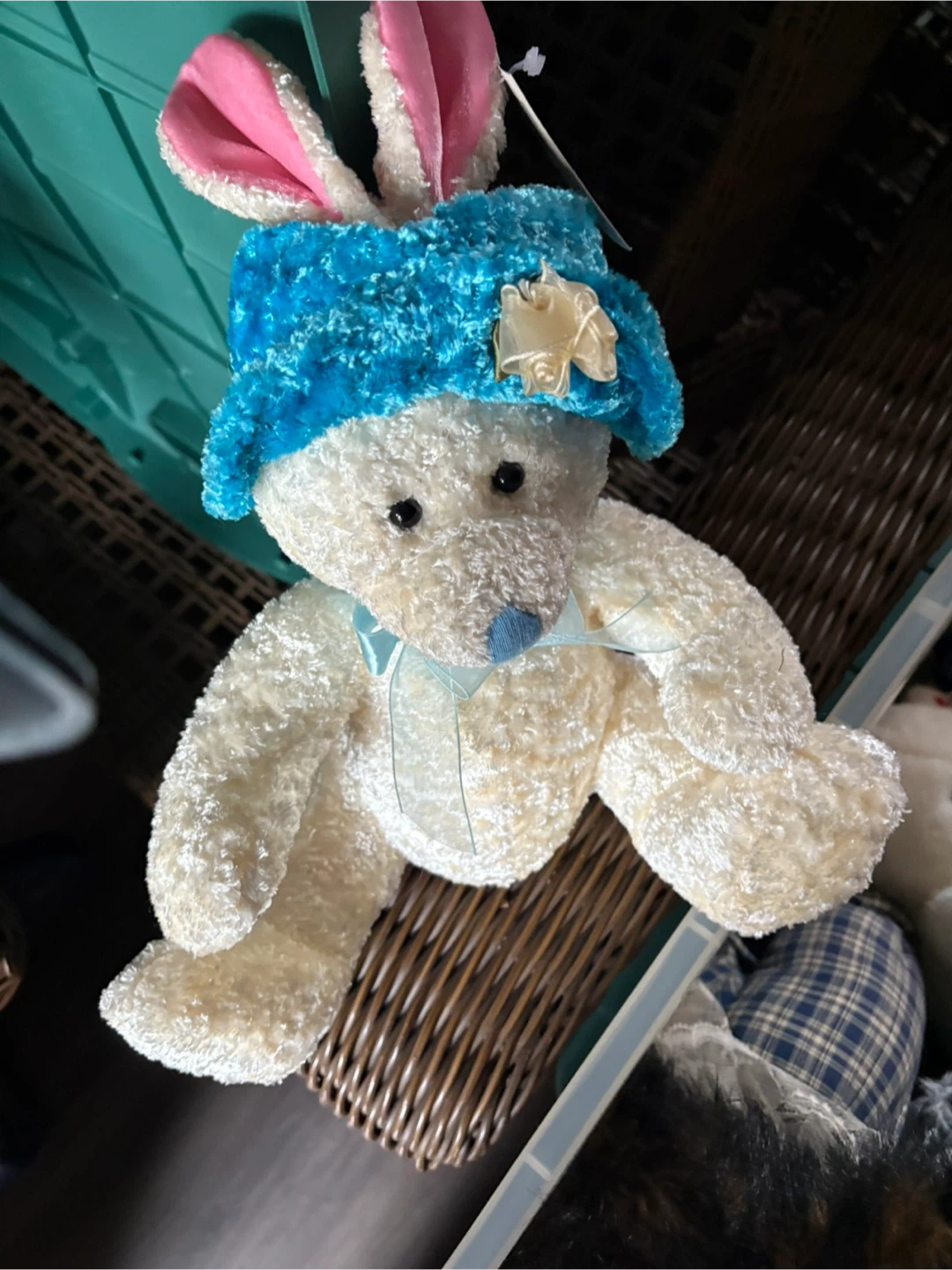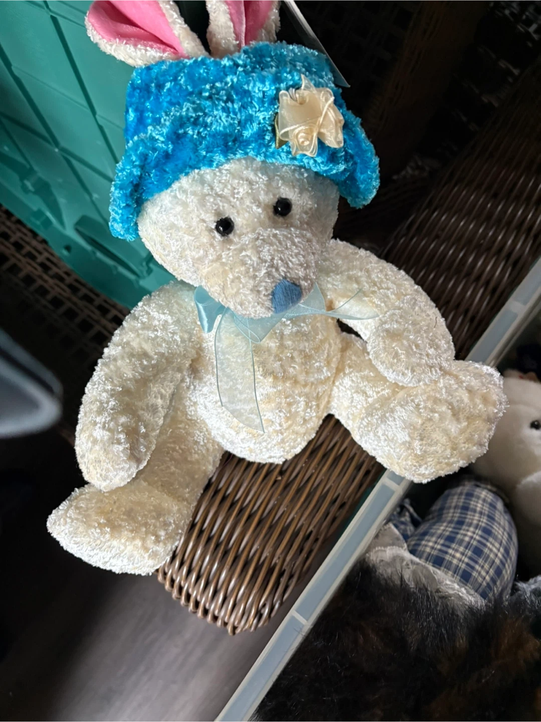 10A cute and cuddly stuffed teddy bear is looking for a new home! It's wearing a charming blue hat with a little flower, making it extra special. This plushie is in great condition and ready to bring joy to someone new cash only