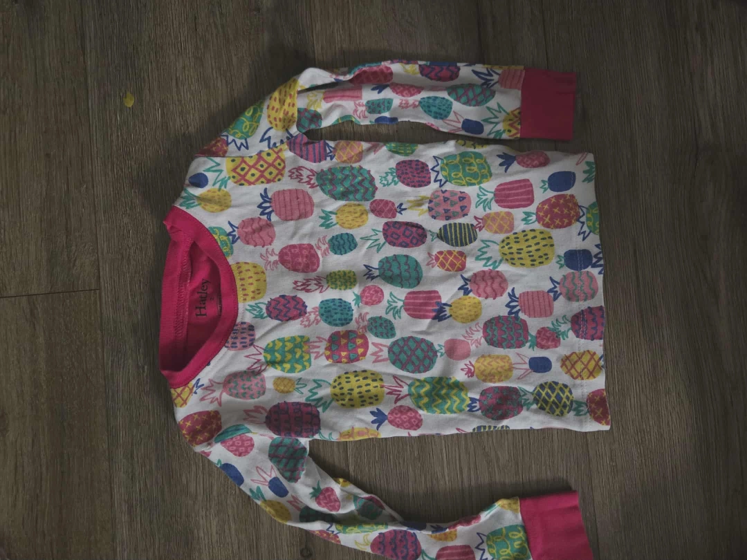A cute and colourful Hatley pajama set for kids, size 5! The top and bottom feature a fun pineapple print. Perfect for a cozy night's sleep!
