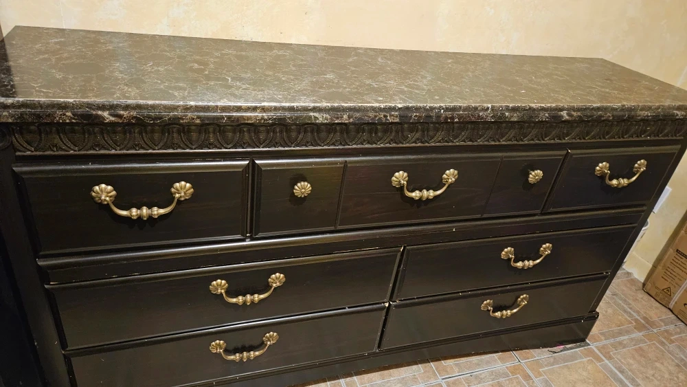 These 5' dark brown dresser with a faux marble top. It features ornate detailing and brass-coloured handles. There is some slight wear and tear on the edges, as pictured. Barely used.
