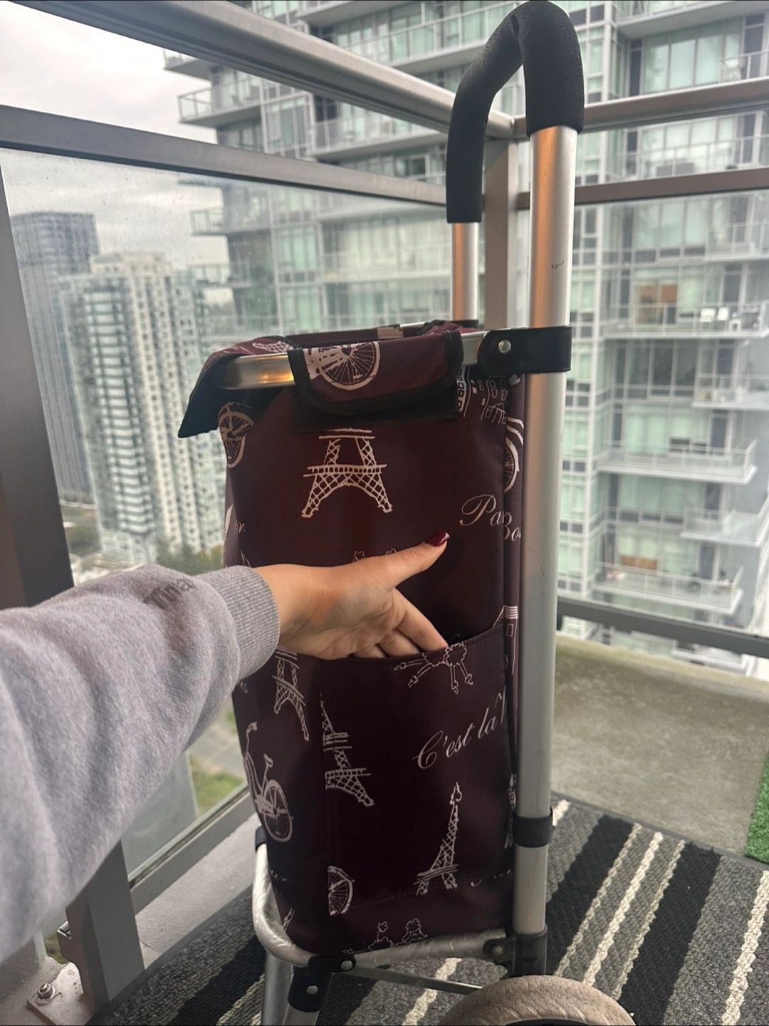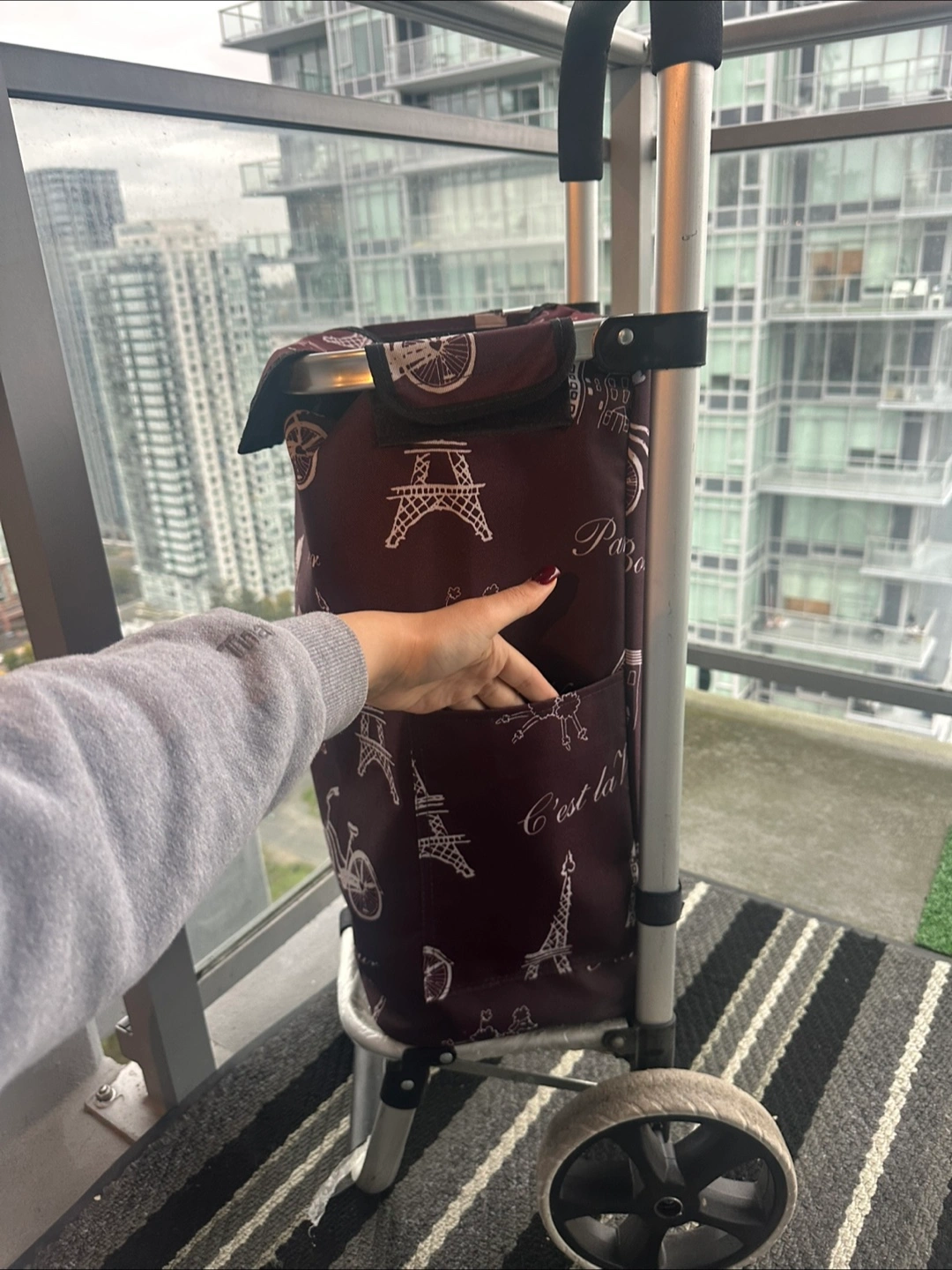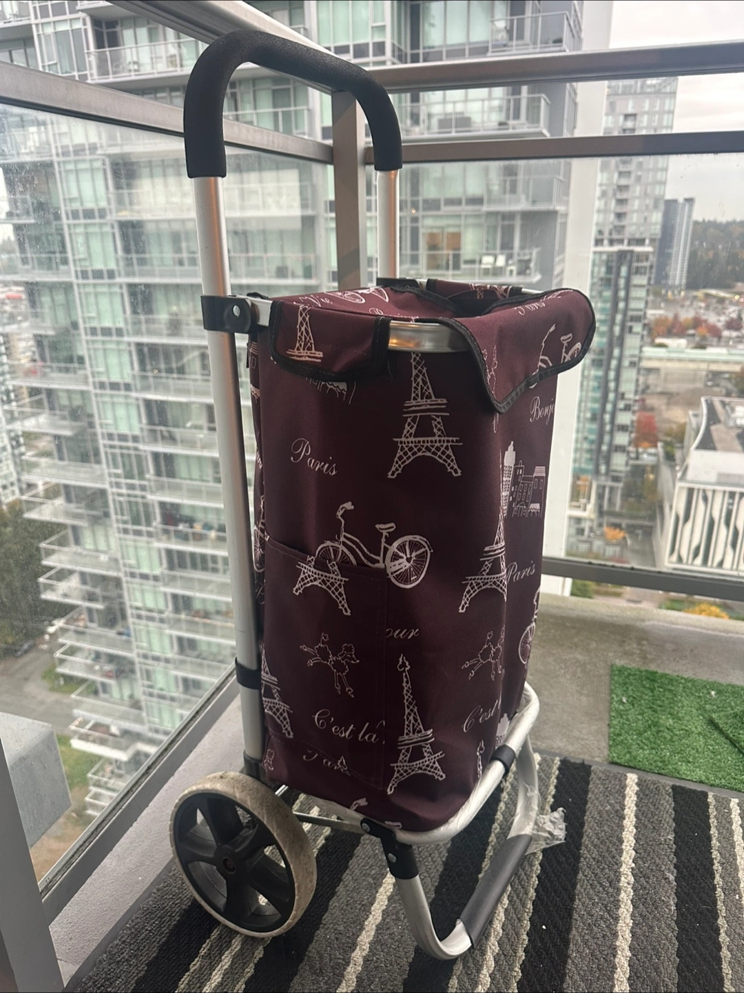 Shopping cart featuring a charming Paris-themed design! It's perfect for carrying groceries or other items with ease. The cart is in good condition and ready for its next adventure