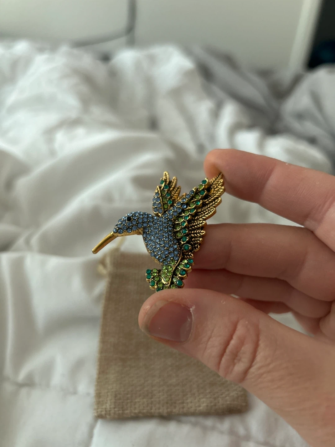 89This is a beautiful hummingbird brooch pin! It features lovely rhinestones in shades of blue and green, set in a gold-tone metal. It comes with a small burlap bag, perfect for gifting or storage. Add a touch of sparkle to any outfit with this eye-catching accessory