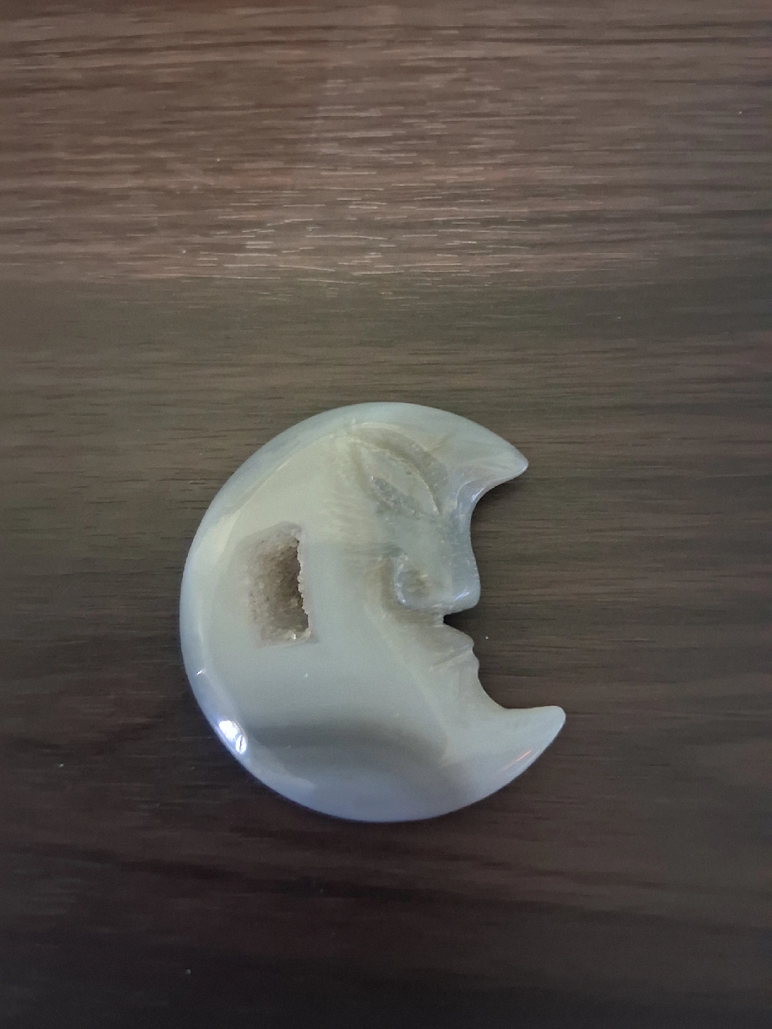 452Selling a moon-shaped agate crystal. It has a unique design with a face carved into the moon and a small druzy geode on the inside. Would look great in any room!