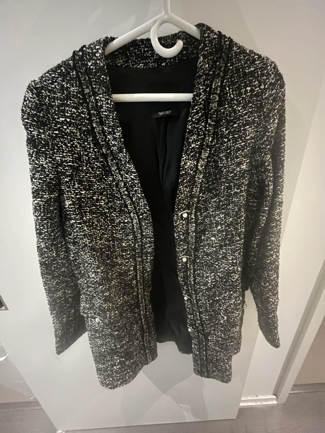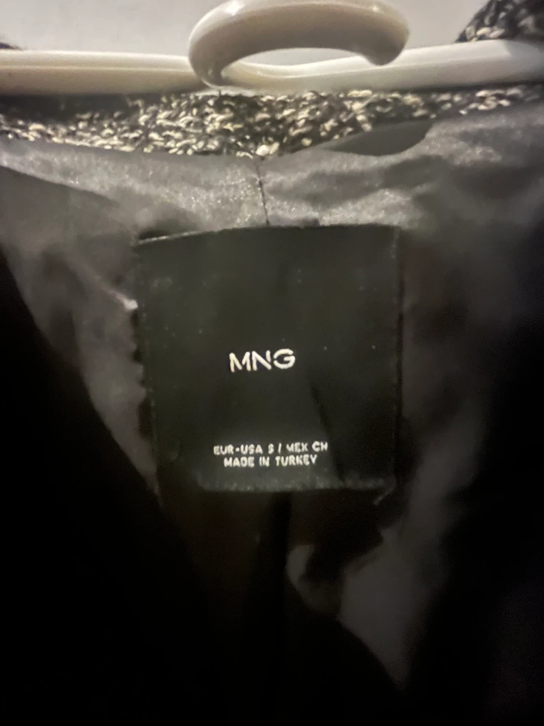 Chic classic black and white tweed jacket by Mango. Features a textured knit design. Ideal for layering.