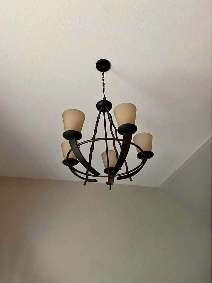 Bronze light fixture with 5 frosted bulb shades. Lightbulbs not included. One bulb in photo is burned out but connection is good after testing with a new bulb.