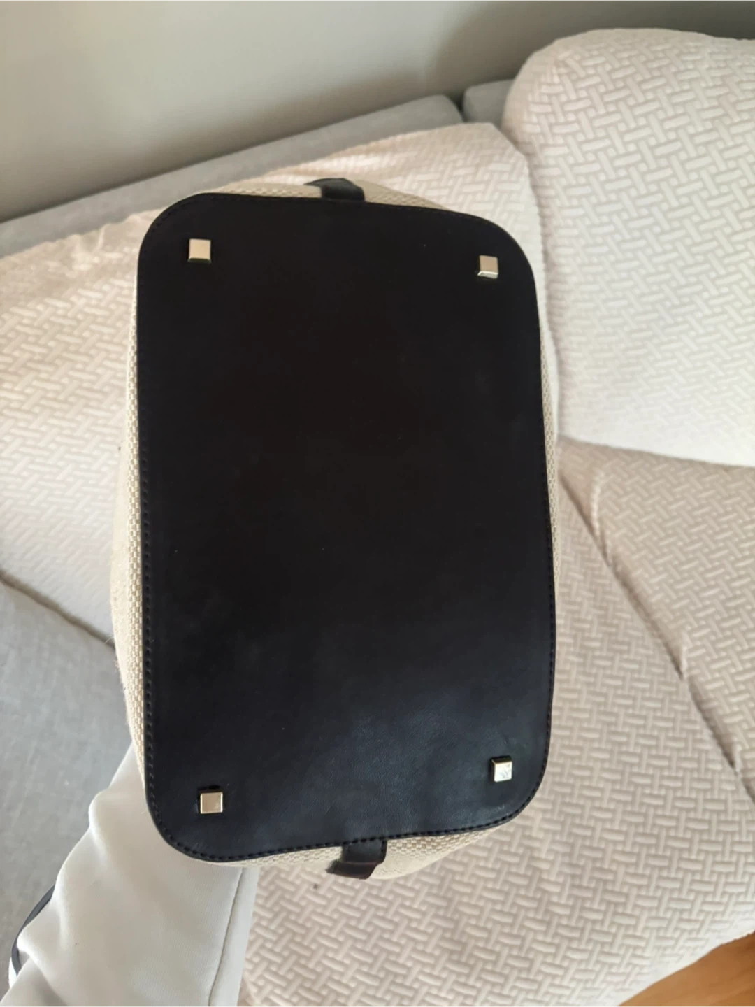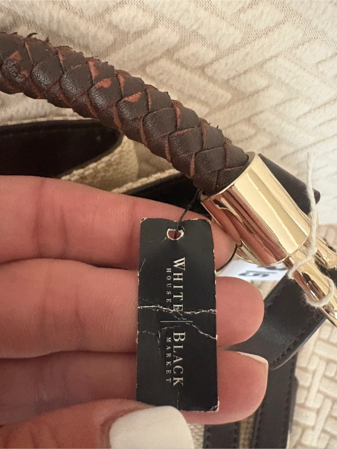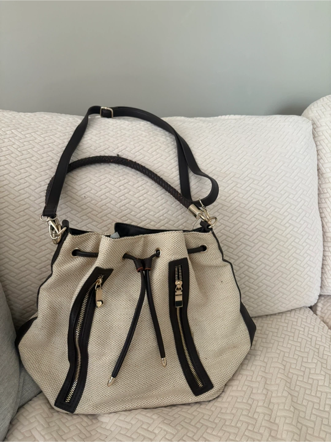 White House Black Market bucket bag in great condition! It features a drawstring closure and braided handles. The bag is made of a cream-coloured canvas with black leather accents and gold-tone hardware. Originally bought for $100+ tax