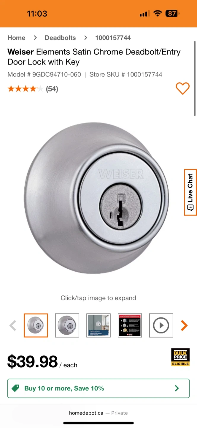 I'm selling a brand new Weiser Elements single cylinder deadbolt in satin chrome! It comes with a key and is still in its original packaging. Originally bought for $39.98!