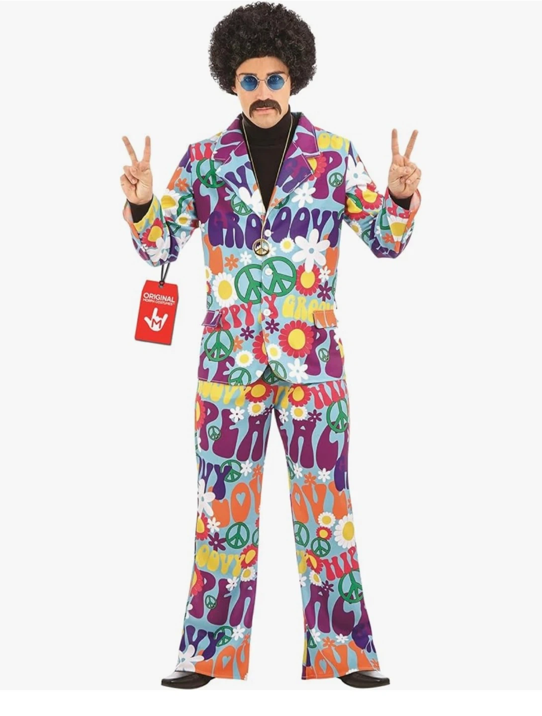 Get ready to groove with this complete 70s hippie costume set! Includes a patterned suit jacket and flared trousers, a wig, round pink glasses, It’s new and comes with a case. It has never been used and was purchased two days ago.