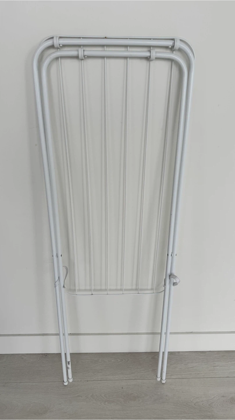 Selling a clothes drying rack in white. It's in great condition and folds up for easy storage when not in use. Perfect for small spaces or for air-drying clothes indoors.