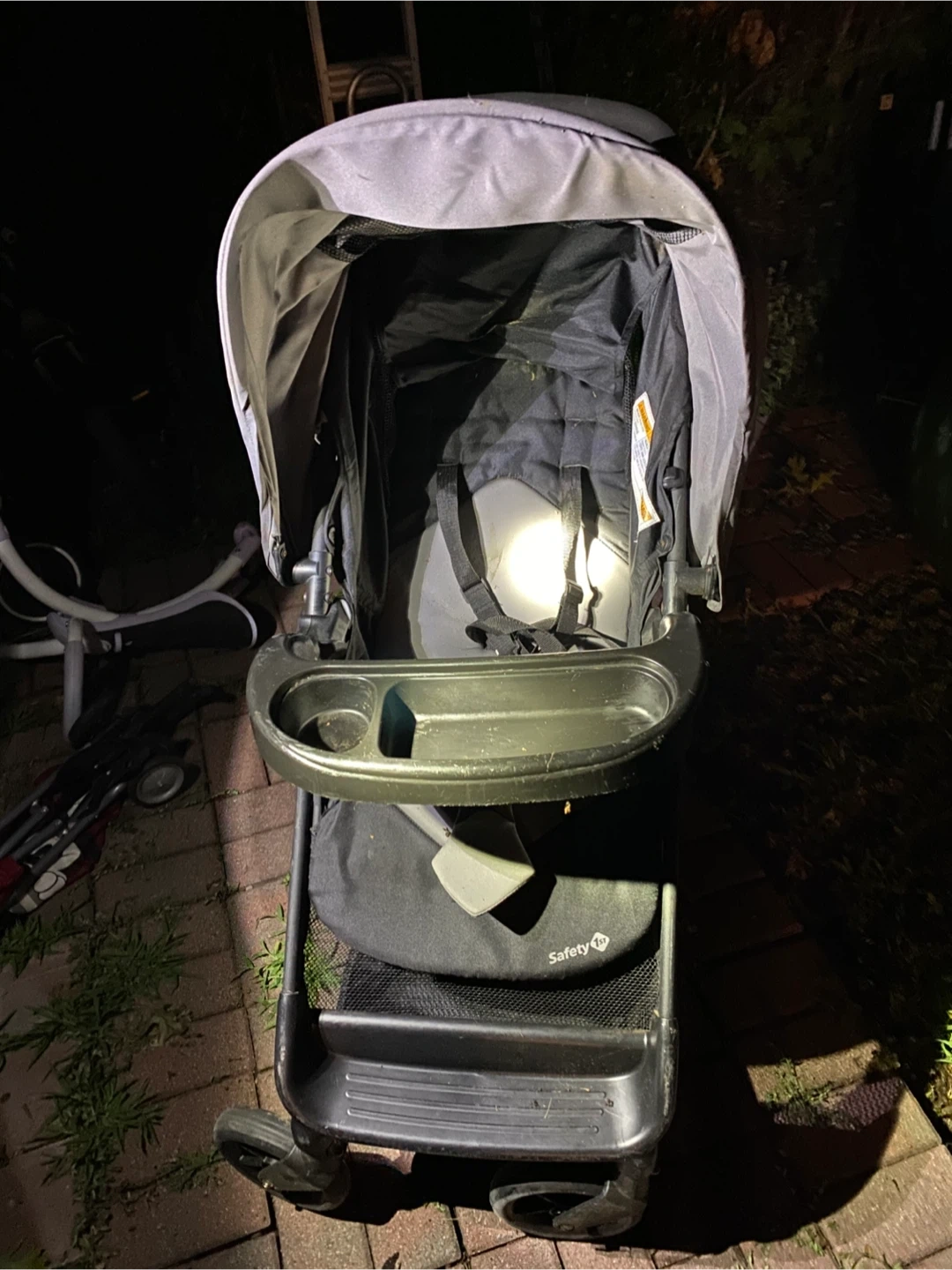 Selling two strollers: an UPPAbaby stroller with a red seat and a Safety 1st stroller in gray. Both are in good condition and ready for a new home