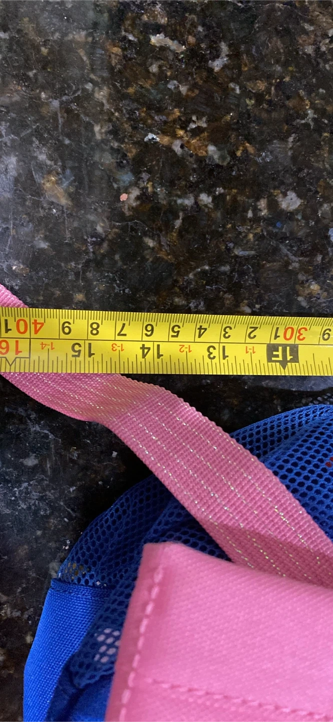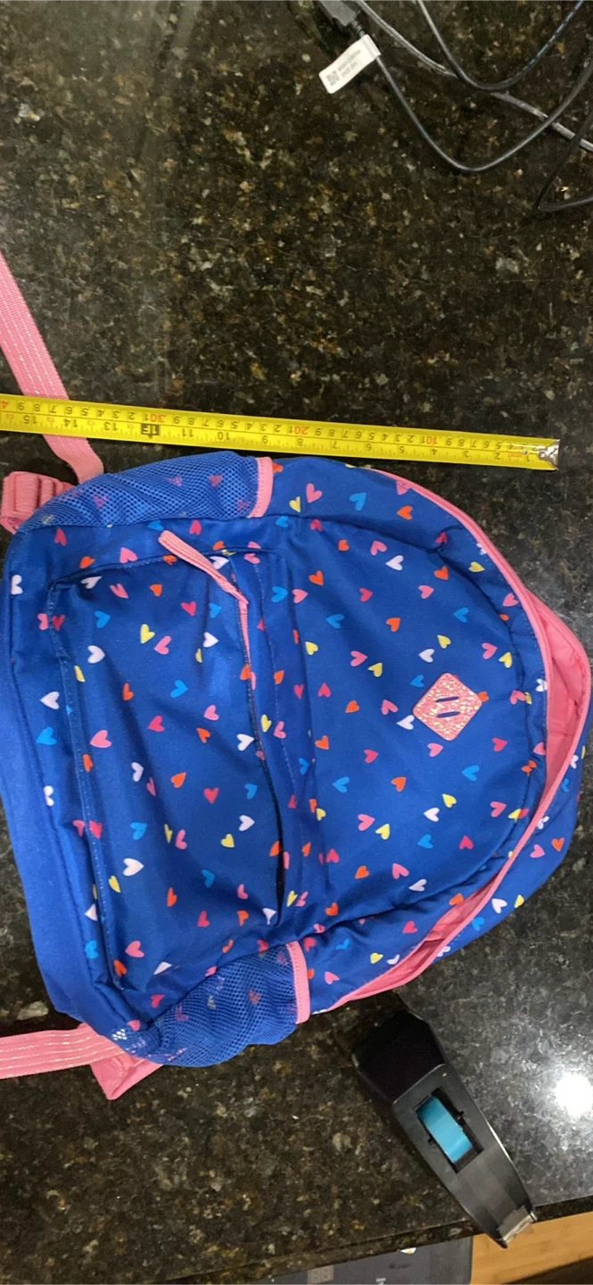 This is a cute Cat & Jack backpack for kids! It's blue with a colorful heart pattern and pink accents. It looks to be about 16 inches in height.