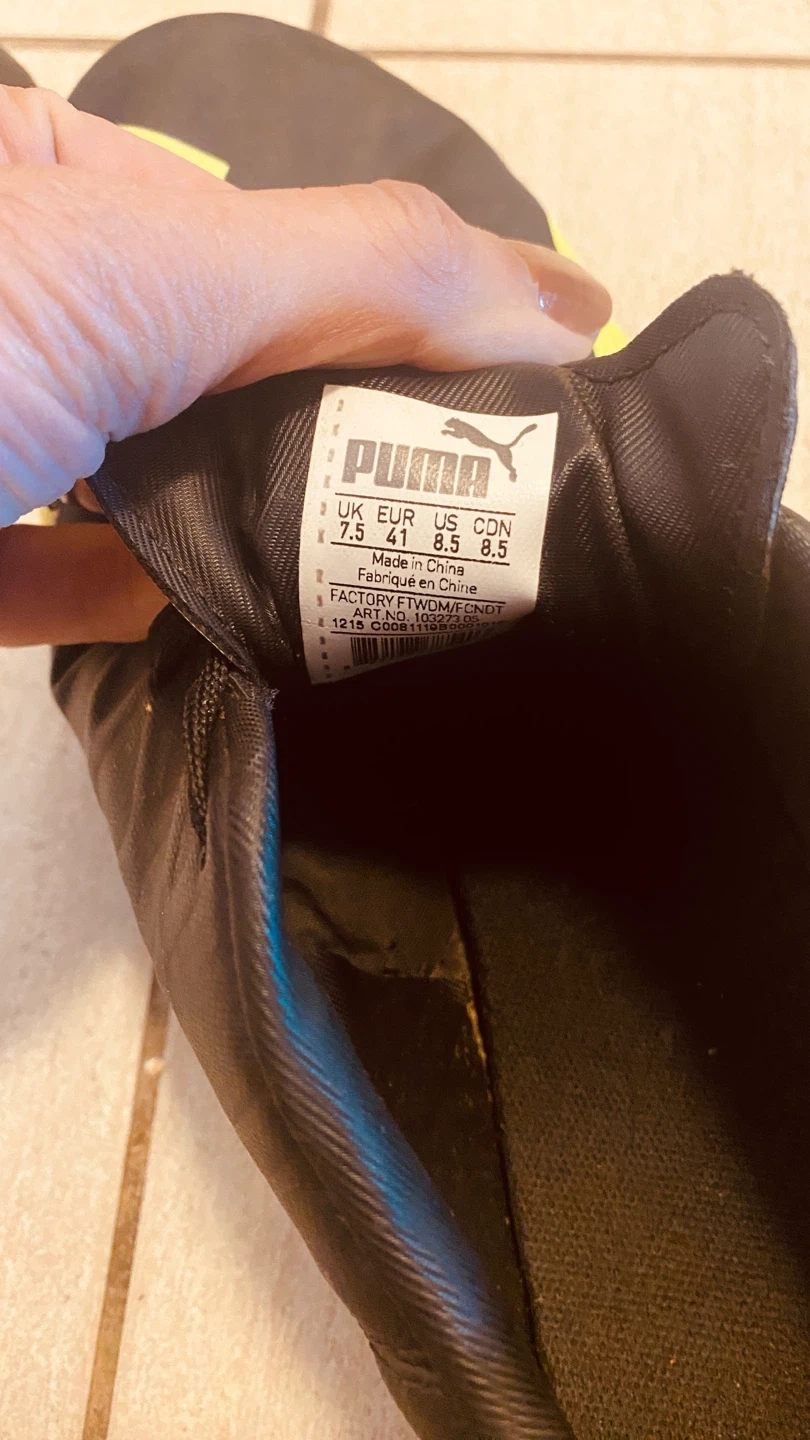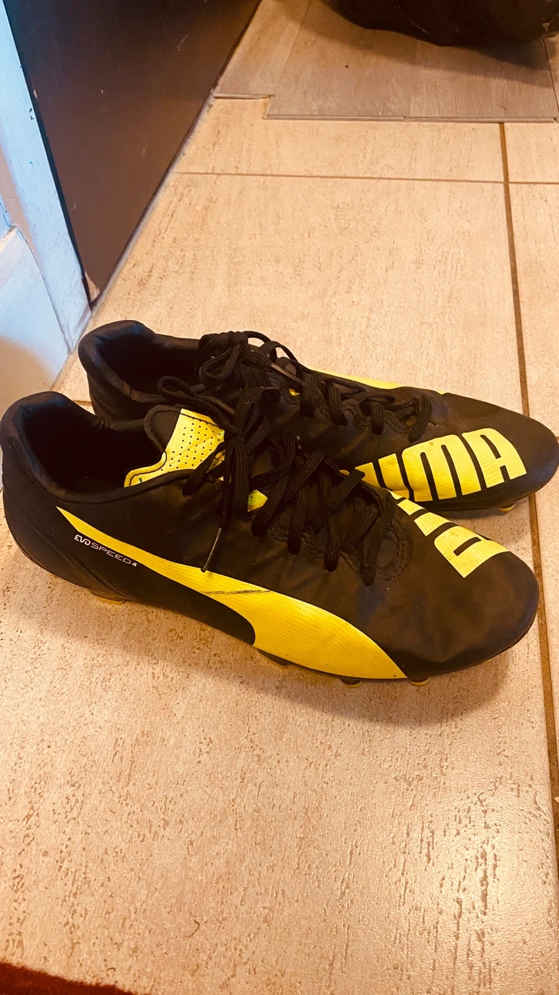 Selling a pair of Puma Evospeed 4.5 soccer cleats in size US 8.5. They are black with yellow accents. Great for the upcoming soccer season!