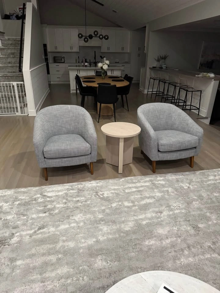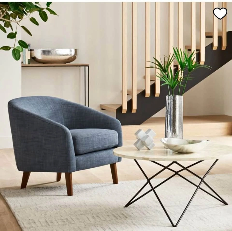 Two West Elm Jonah Chairs, Yarn Dyed Linen Weave, Shelter Blue, Pecan legs - lightly used, very good condition.