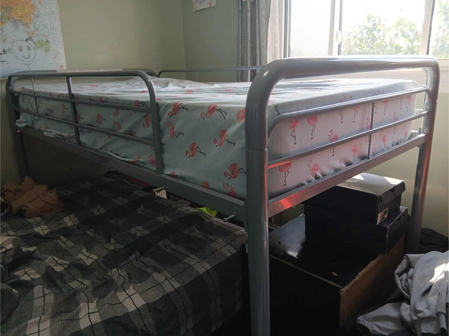 Selling a metal loft bed frame in twin size. It's a great space-saver, perfect for smaller rooms! The frame is sturdy and in good condition. It's a simple and practical design, ready for a new home