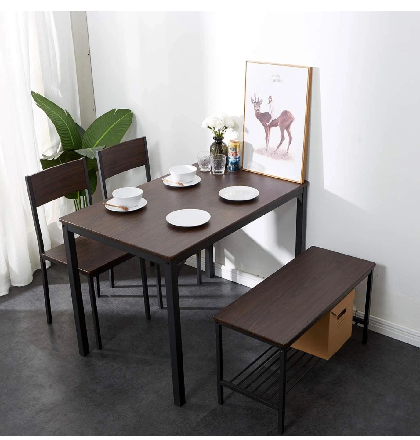 This dining table set includes a table, a bench, and two chairs, perfect for a small dining area or kitchen. The dark wood finish and metal frame give it a modern, industrial look. It's sturdy and in great condition, ready to be the centrepiece of your dining space!