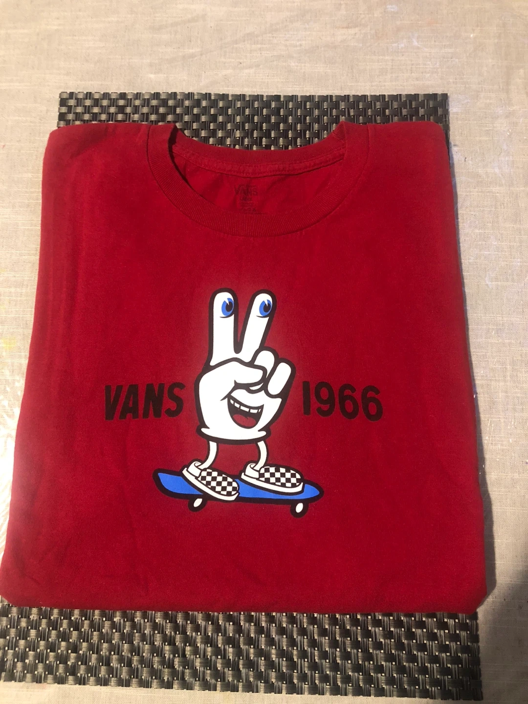 Selling a red Vans T-shirt with a fun graphic! The shirt features a cool design with the Vans logo and '1966'. It's in good condition and ready for a new home!