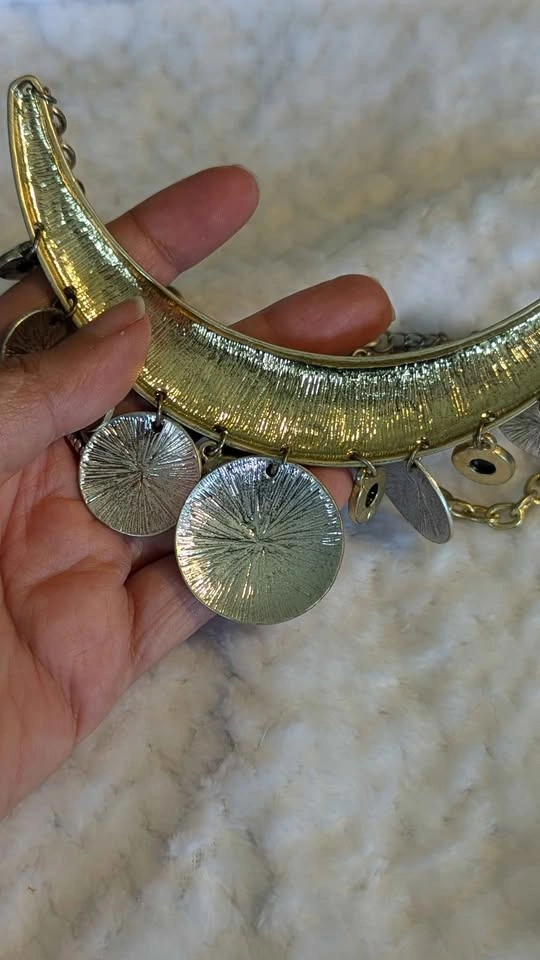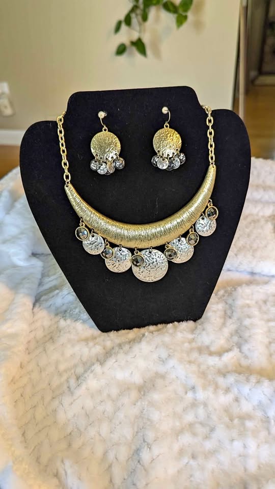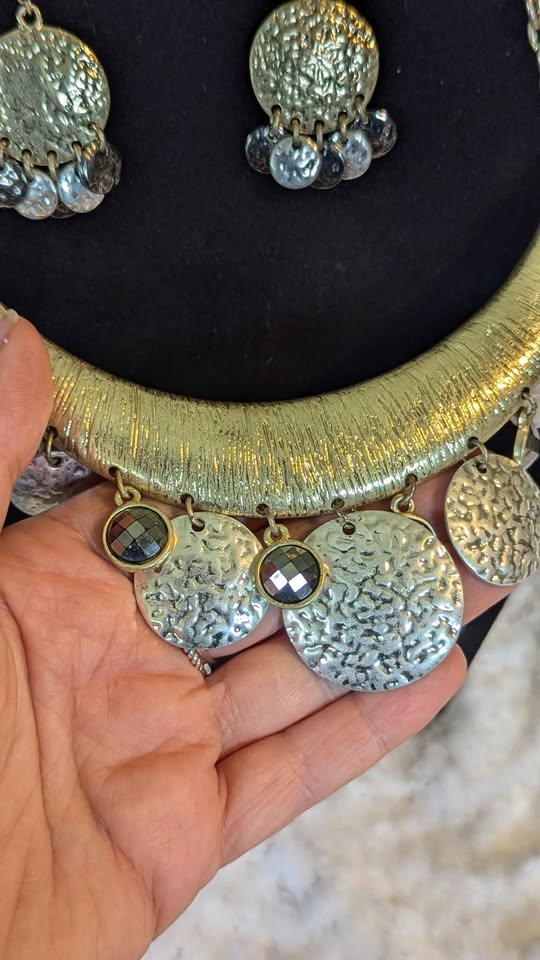 Striking boho-glam statement set featuring a bold crescent-collar necklace and matching earrings. Each piece combines gold- and silver-tone hammered metal discs with faceted hematite-style accents for a look that’s both elegant and edgy.