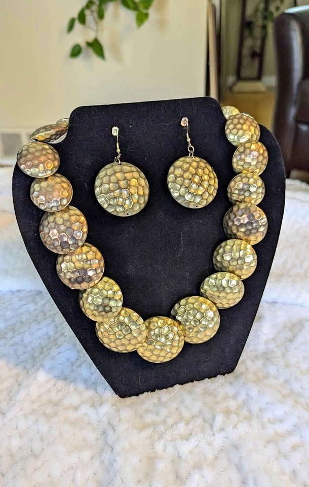 ✨ Vintage Hammered Metal Statement Necklace & Earrings Set