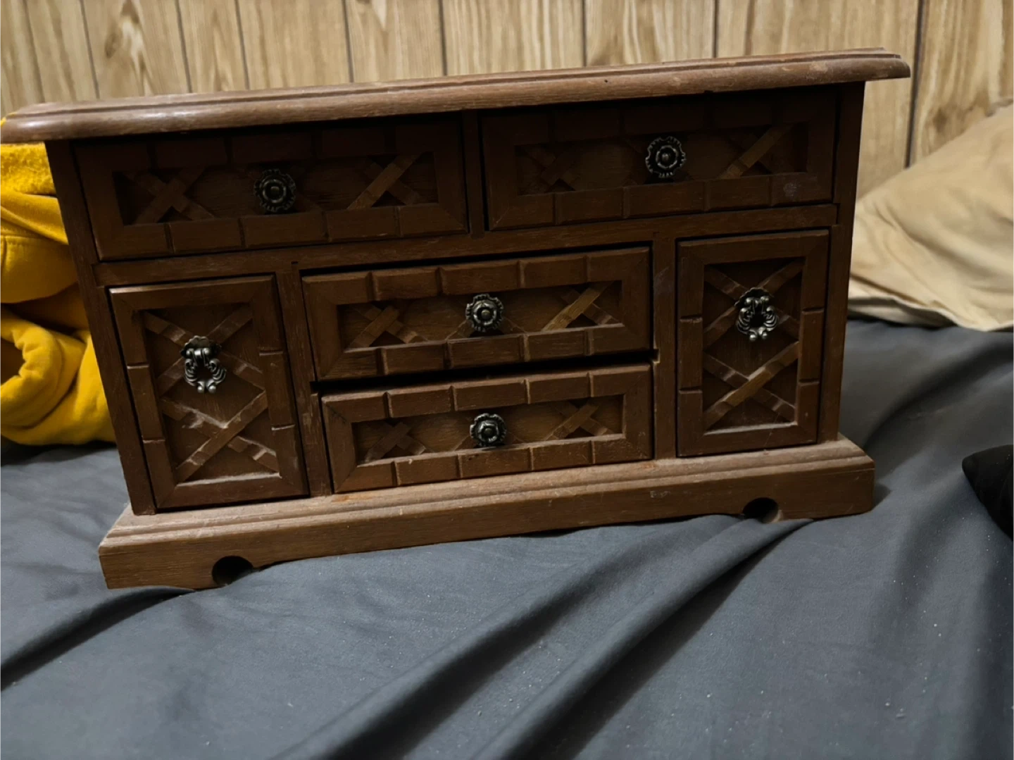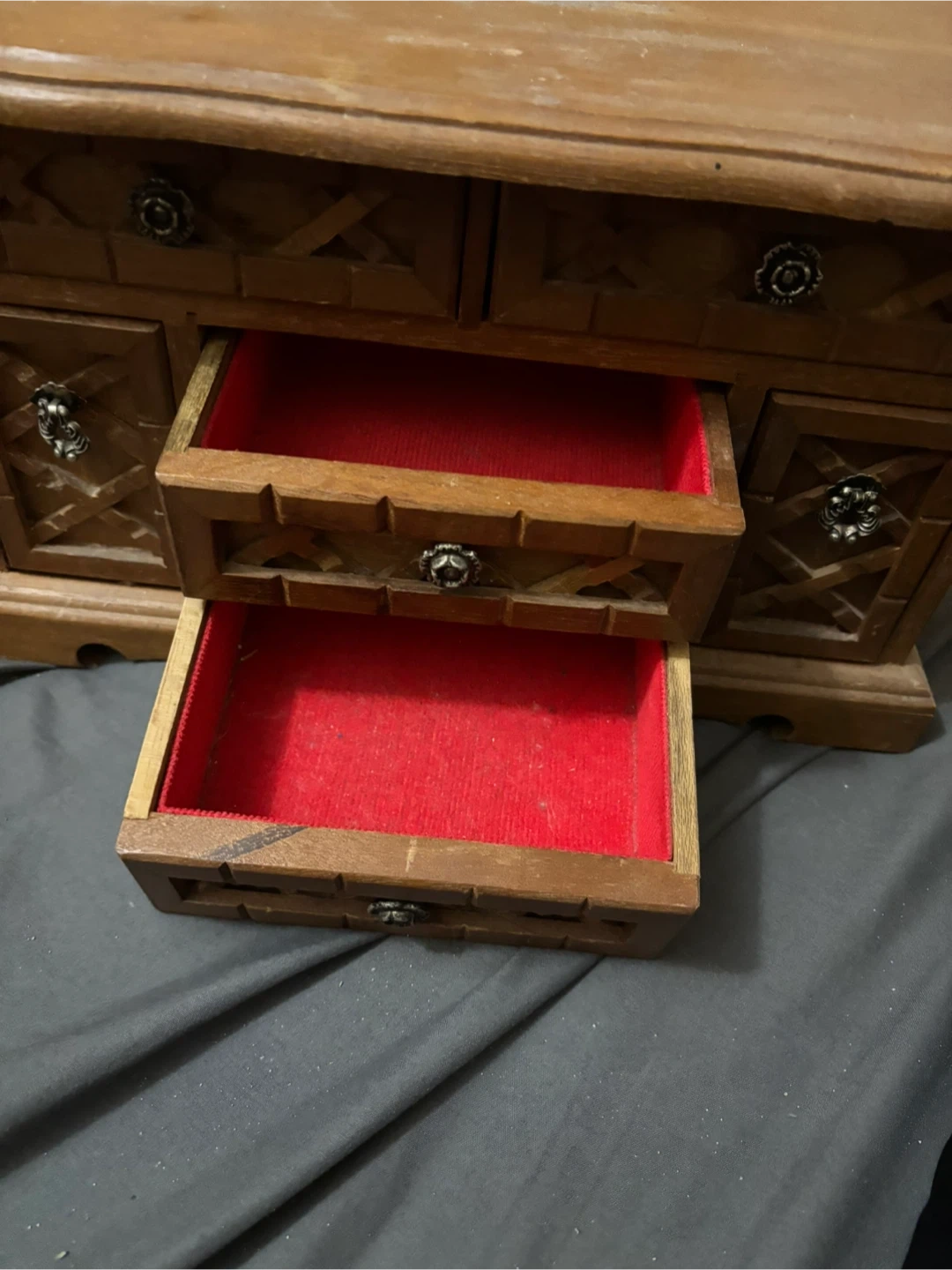Selling a lovely vintage wooden jewellery box! It features multiple drawers and compartments lined with red felt, perfect for storing your rings, necklaces, and other treasures. The box has a charming, classic design with decorative knobs. It's in good condition and ready to find a new home!