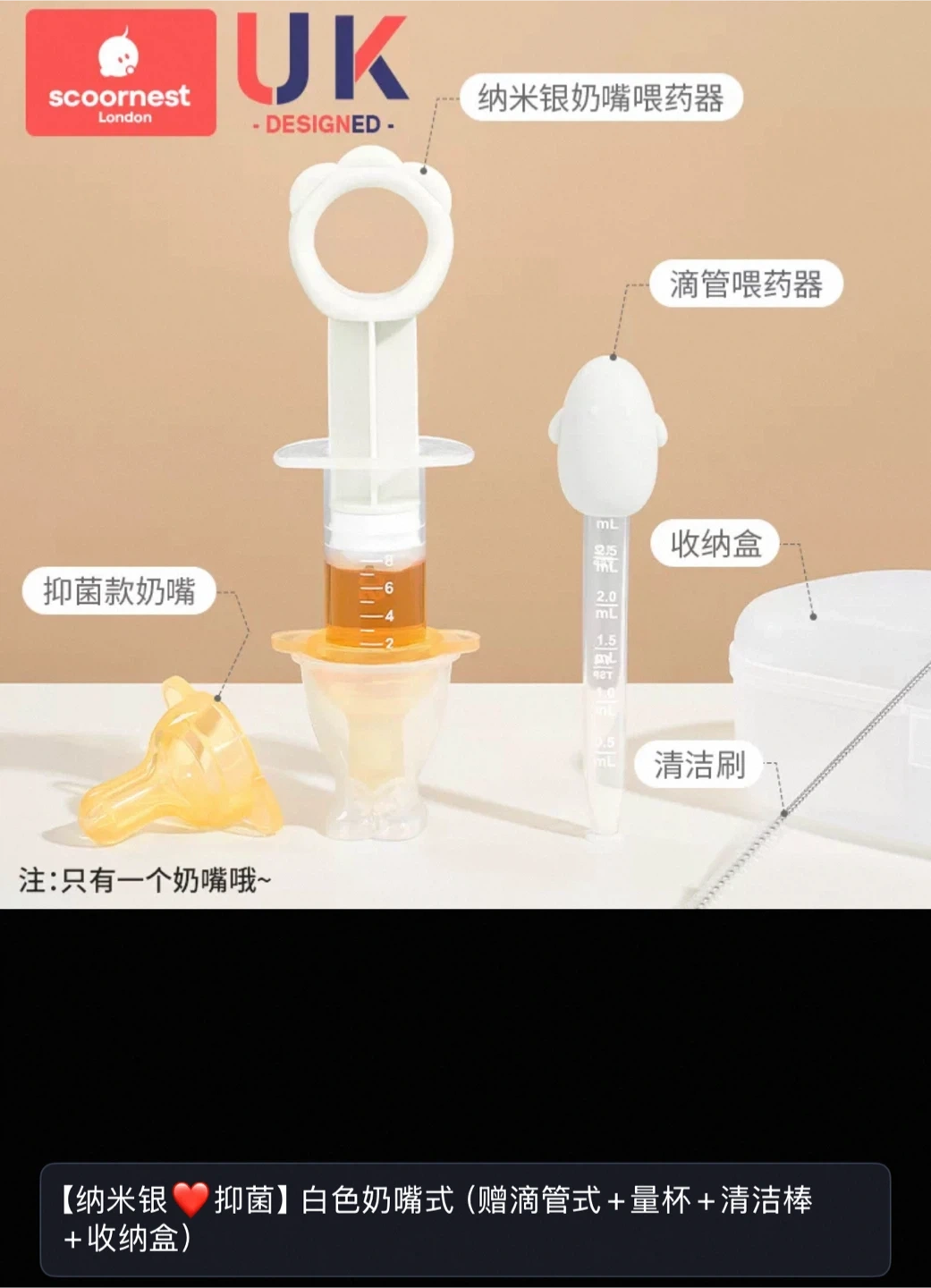 I'm selling a brand new Scoornest London baby medicine dispenser! It's a white, antibacterial pacifier style dispenser that comes with a dropper, measuring cup, cleaning brush, and storage box. Never used!