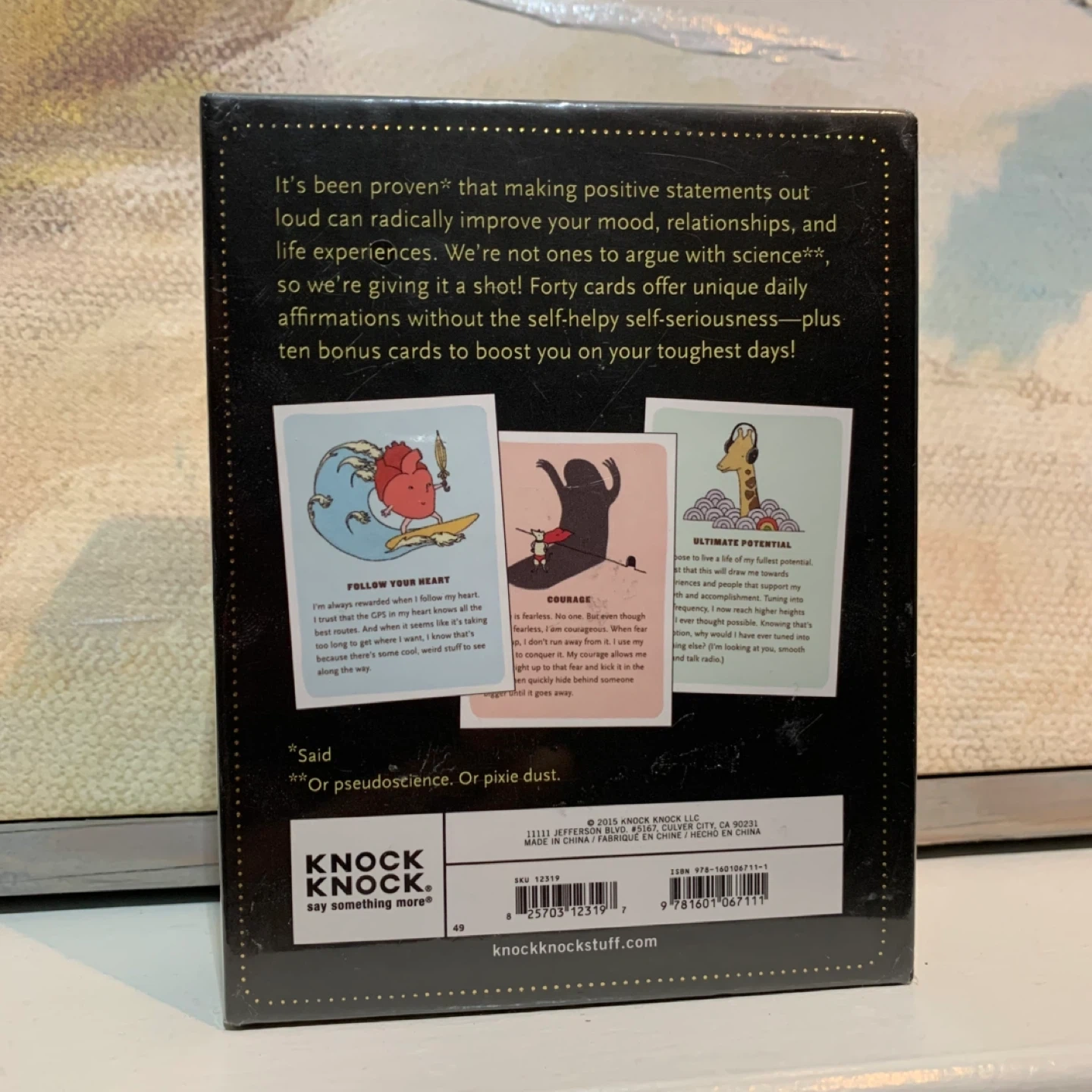 These are Knock Knock Affirmators! 50 Affirmation Cards to help you help yourself--without the Self-Helpy-Ness! It's been proven that making positive statements out loud can radically improve your mood, relationships, and life experiences. Forty cards offer unique daily affirmations without the self-helpy self-seriousness—plus ten bonus cards to boost you on your toughest days! Brand new in packaging