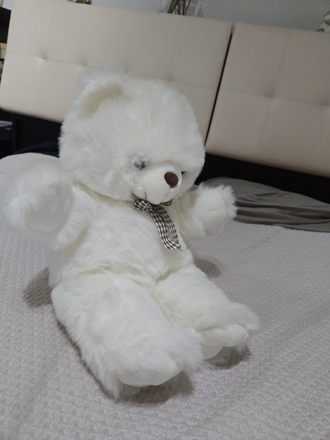 A fluffy white teddy bear is looking for a new home! It's in great condition and has a cute checkered bow tie. Perfect for cuddling or as a decorative piece!