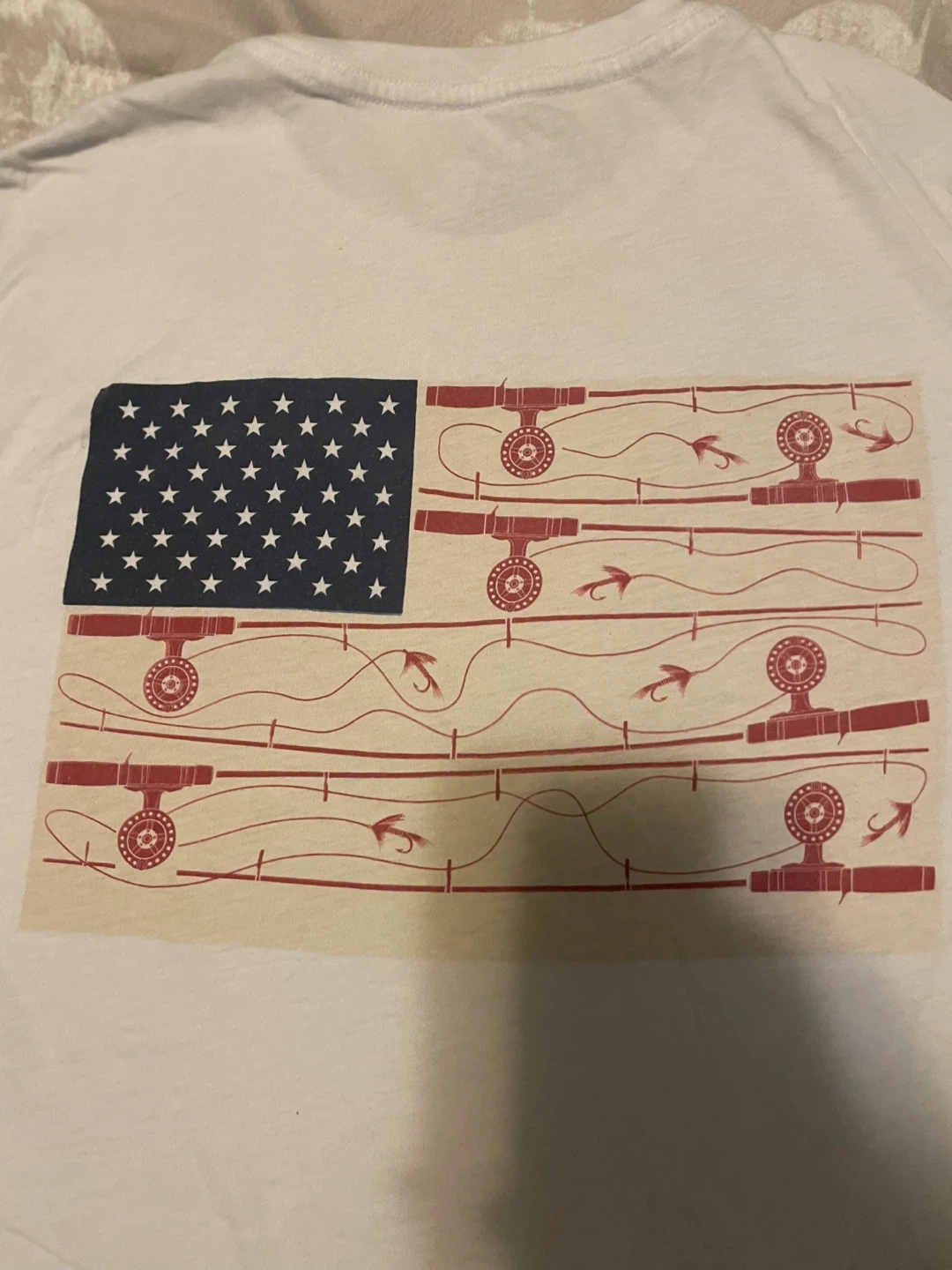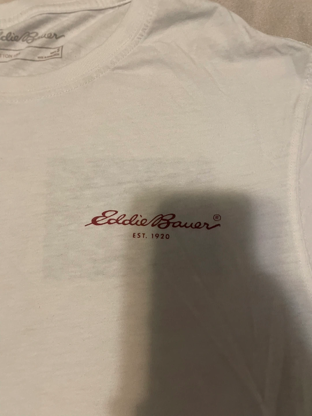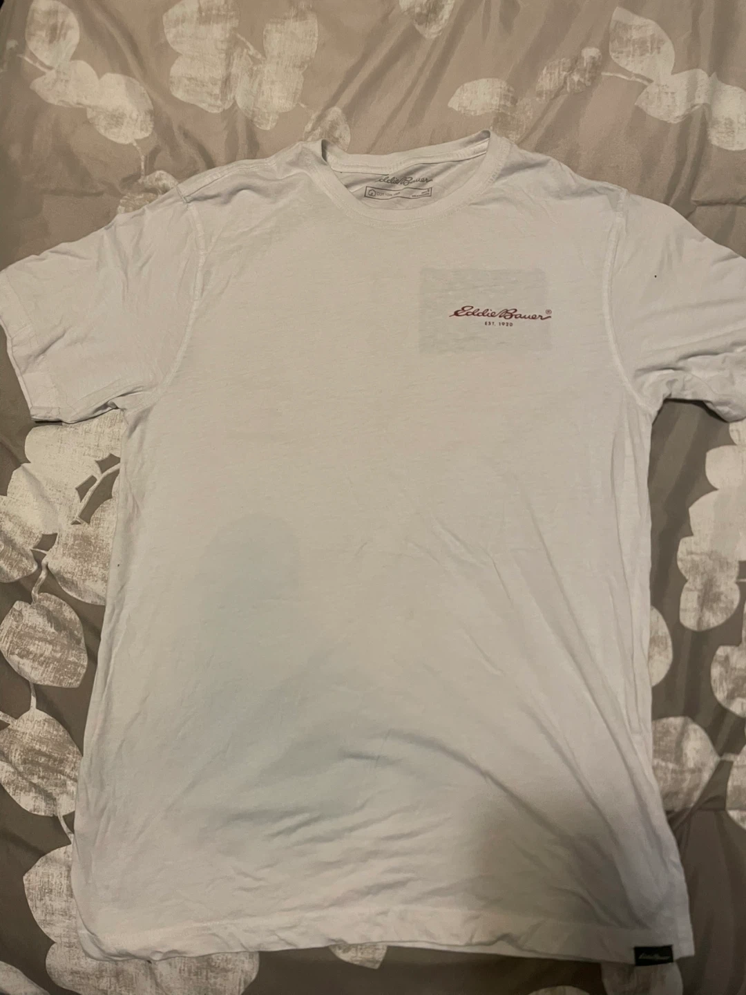 Selling a white Eddie Bauer T-shirt in men's size small. It's made of 60% cotton and 40% polyester. Machine wash cold with like colours and tumble dry low. Great for everyday wear! Has a nice graphic design at the back