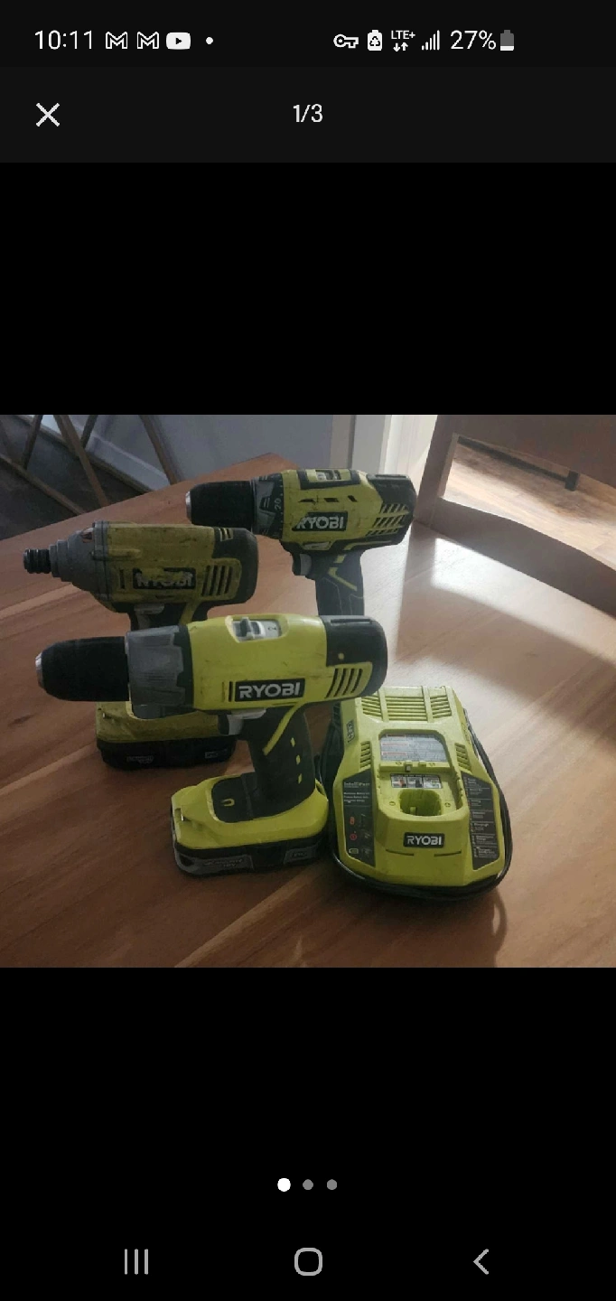 RYOBI 18V Drill set for sale with not 2 drills but 3!. All pieces in good working condition, charged up and ready to use today. Set includes: *2 Driver Drills with batteries ( One in good condition, and one newer model in excellent condition) *1 Impact drill with battery (In good condition) *1 Battery Wall Charger