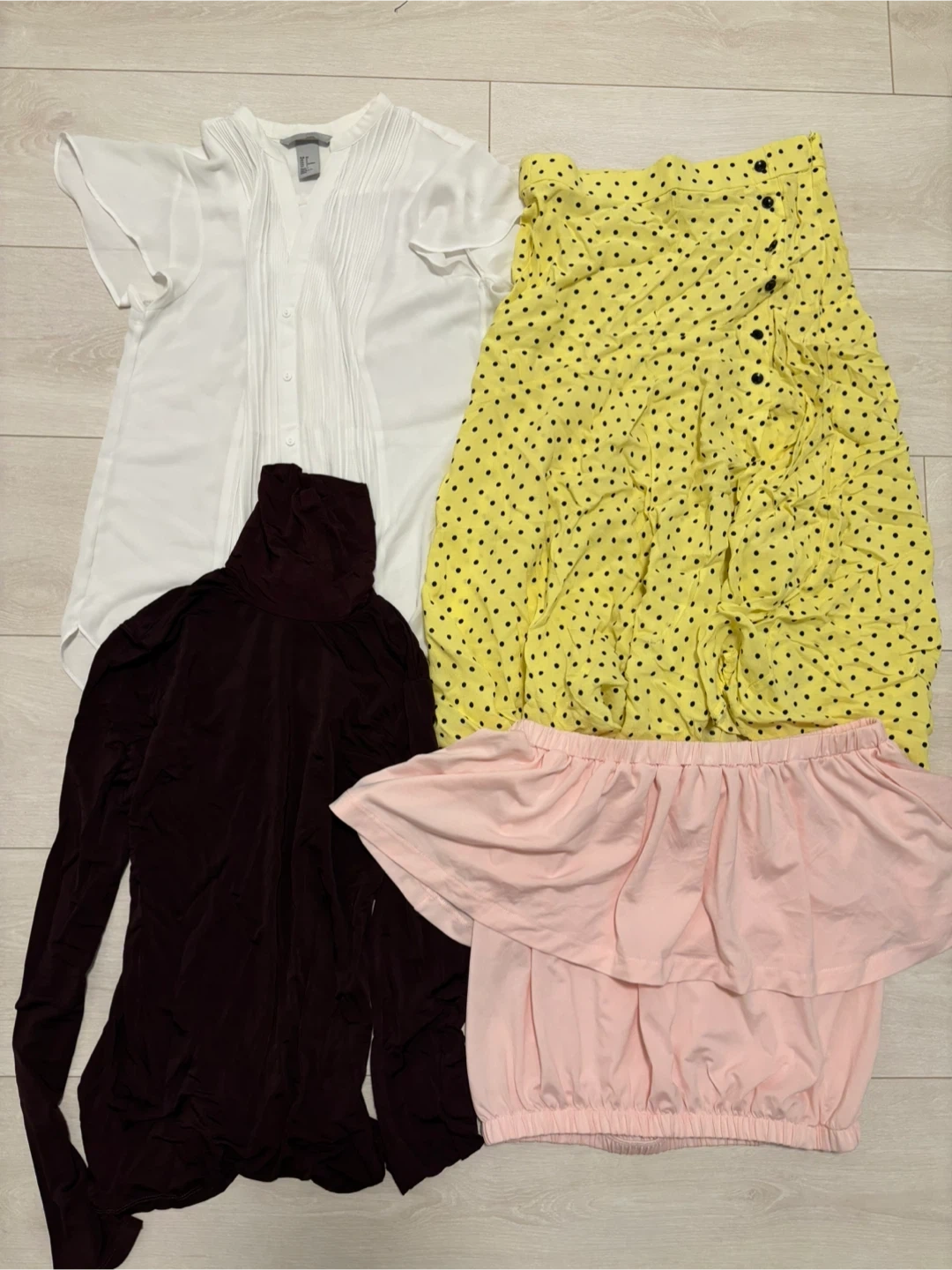 Selling a bundle of four items including a white blouse, a yellow polka dot skirt, a purple turtleneck, and a pink off-the-shoulder top.