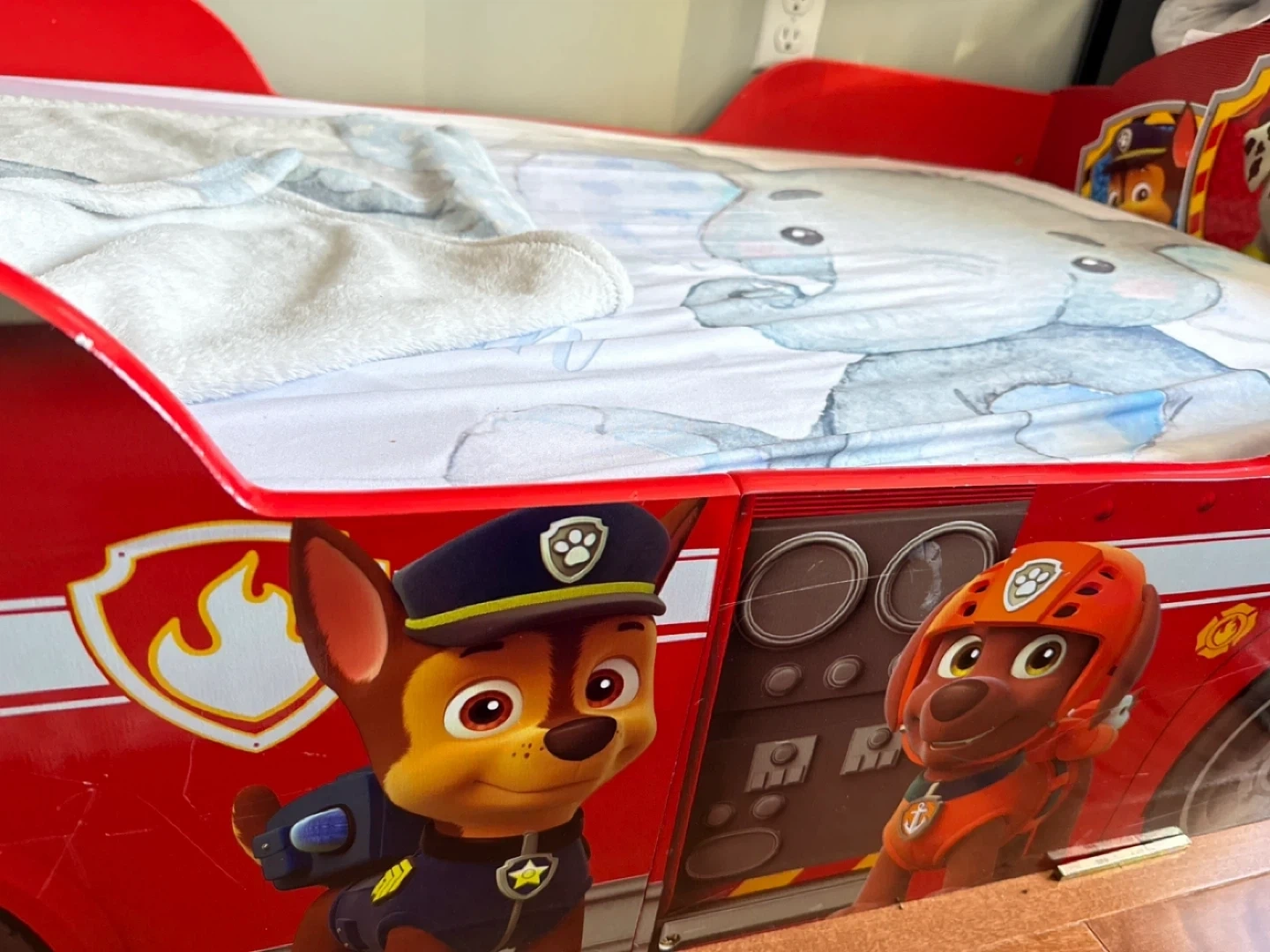 15A cute Paw Patrol toddler bed, perfect for transitioning your little one from a crib! It includes a soft elephant-themed blanket and pillowcase. The bed frame is red with Paw Patrol characters on the sides.