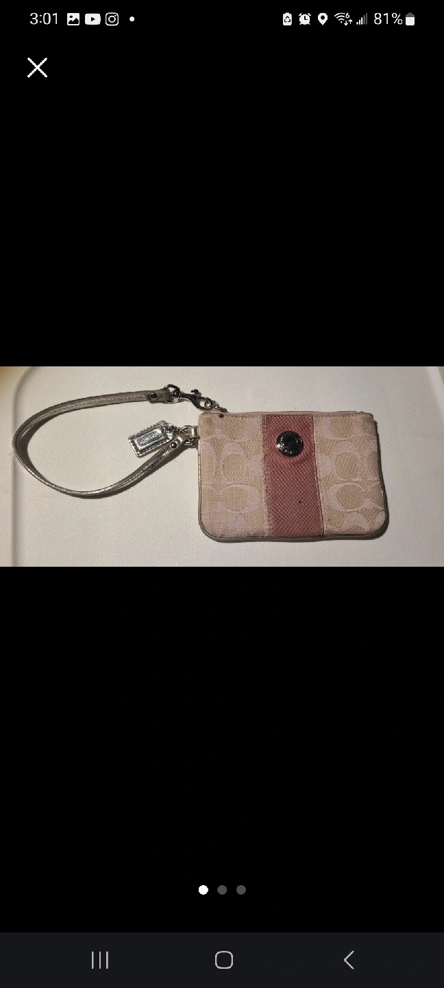 Coach wristlet wallet. It has a pink interior and a silver wrist strap. Perfect for carrying your essentials!