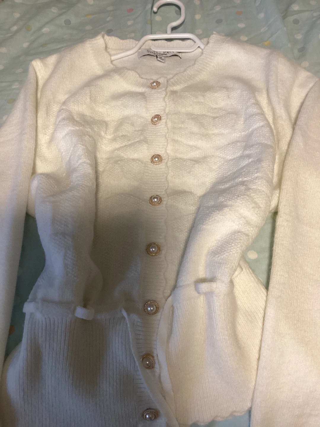 A lovely cream-coloured cardigan from Sweet Rain, size medium! Features pearl-like buttons, adding a touch of elegance to any outfit. It's in great condition, has been worn once, never worn outside, and ready for a new home.
