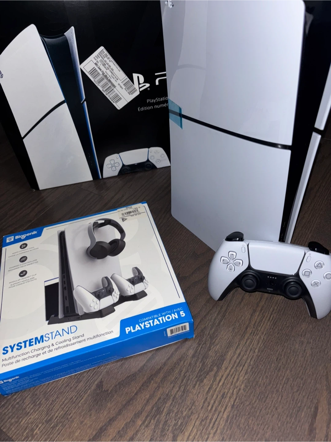 Selling a brand new PlayStation 5 Slim (Digital Edition) in its original box, along with a Biogenik Multifunction Charging & Cooling Stand — designed specifically for the PS5.