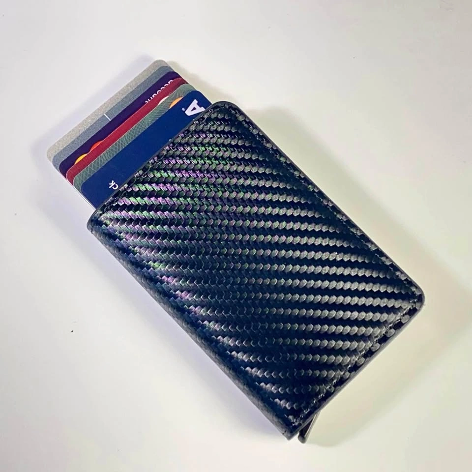 60Save the ‘Amazon Tax’… I purchased a few of these for gifts and a future replacement for the one I’ve been using for the past 3 years. Carbon fibre look with aluminum sleeve with switch to raise cards. Comfortably holds 6-7 cards in RFID blocker slot (depending on thickness) Plus 2 card slots on wallet Holds 3-4 folded bills tightly