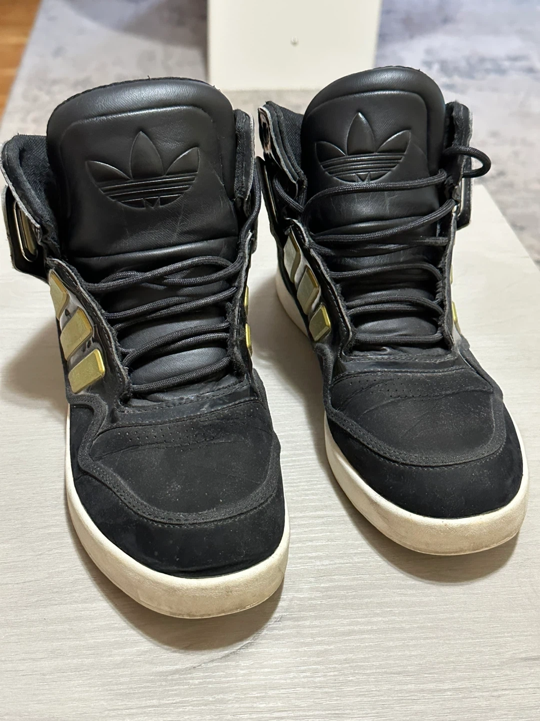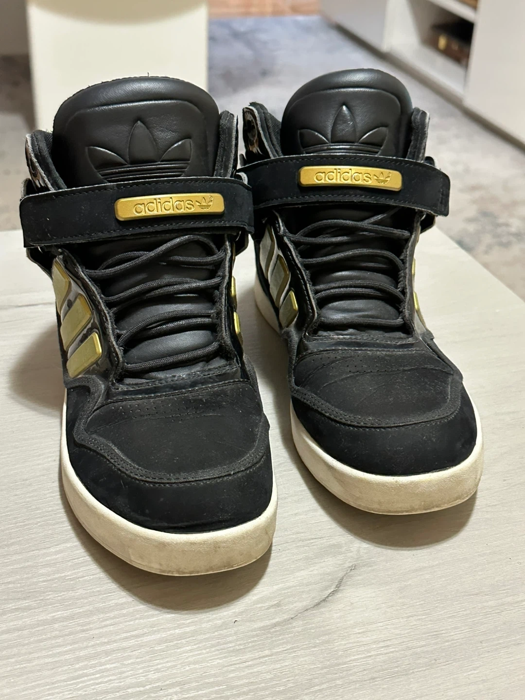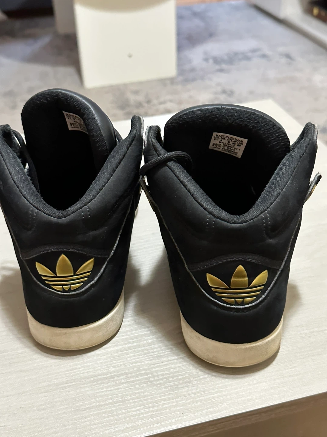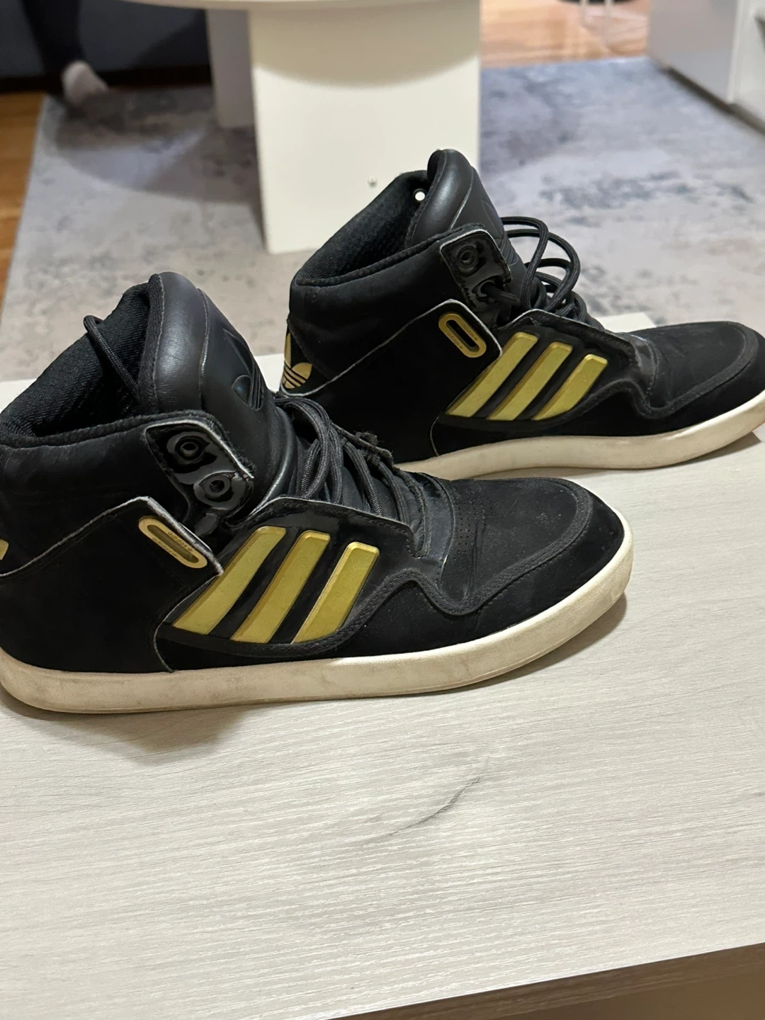 65Selling a pair of Adidas high-top sneakers in size 8.5. The shoes are black with gold accents. They are in good condition and ready for a new home!