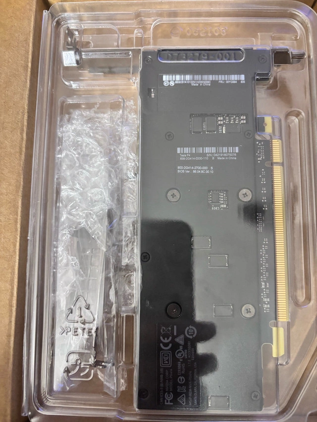This NVIDIA Tesla P4 8GB graphics card is brand new and ready to power your high-performance computing needs. With its efficient design and ample memory, it's perfect for machine learning, data analytics, and professional visualization tasks. Key Features: * 8GB GDDR5 Memory * Pascal Architecture * Low Power Consumption * Optimized for Deep Learning * PCIe 3.0 Interface